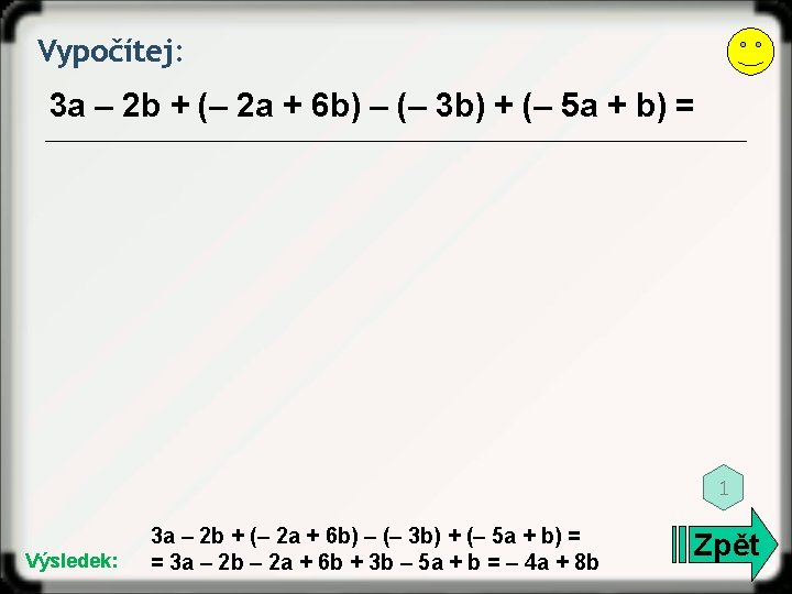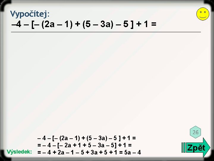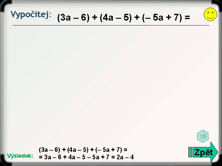 Vypočítej: 5 – 2 a + 6 a – 3 = 3 Výsledek: 5 – 2 a + 6 a – 3 = 4 a +2 Zpět