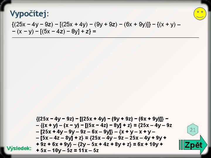 Vypočítej: (x + 2 y – 3 z) – (x – 2 y – 3 z) = 17 Výsledek: (x + 2 y – 3 z) – (x – 2 y – 3 z) = = x + 2 y – 3 z – x + 2 y + 3 z = 4 y Zpět