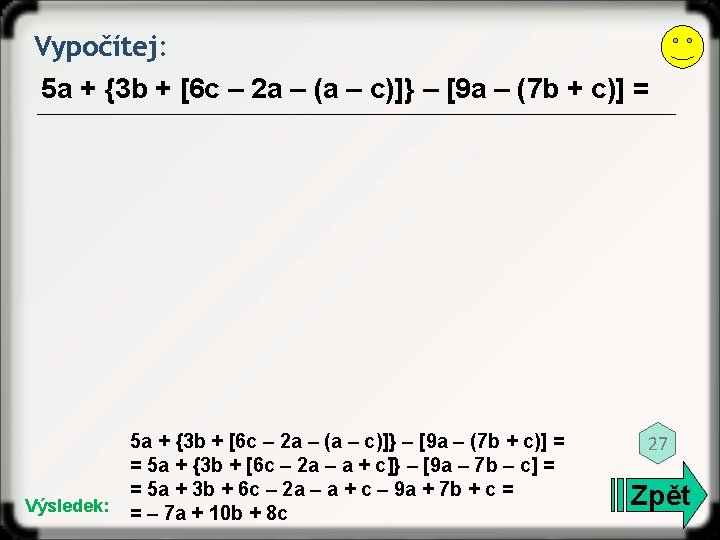 Vypočítej: 9 a – (7 a + 11) = 5 Výsledek: 9 a – (7 a + 11) = 9 a – 7 a – 11 = 2 a – 11 Zpět