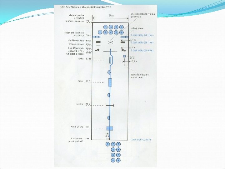 58 m od startu je vpravo , 0, 5 m od okraje dráhy, umístěna bedna na odložení hadicových nosičů 59 m – zakreslena ohraničující čára označující místo ukončení hadicového vedení Druhý úsek dráhy Od značky 60 m až po značku 65 m 2 ks džberových stříkaček s 10 l vody (na značce 60 m), vždy na levé a pravé straně soutěžní dráhy, 1 m od okraje dráhy. Hadice D dlouhé 3 m + max. 0, 2 m a proudnice s hubicí o průměru max. 4 mm. Nádoba s 10 l rezervní vody je umístěny u každé džberové stříkačky 2 m před nástřikovými stěnami je červená lať označující hranici stříkání