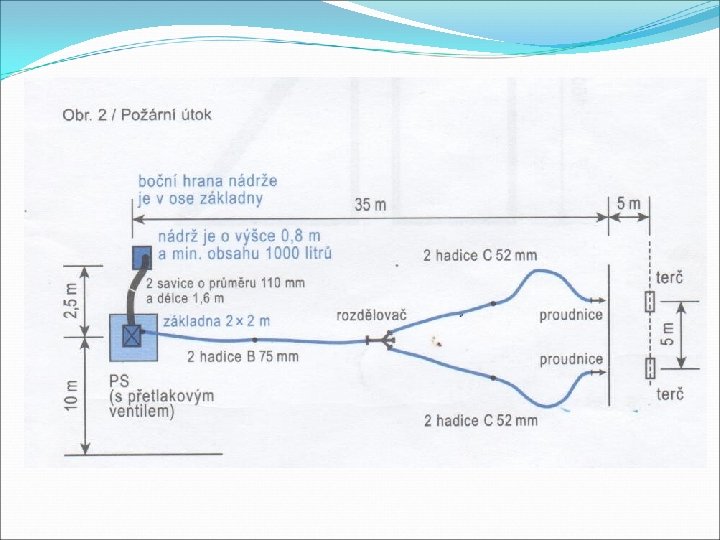 Provedení útoku �Před zahájením útoku nastartuje dospělý strojník stříkačku �Na signál startéra vybíhá soutěžní družstvo od startovní čáry ke stříkačce, od níž: �Starší kategorie utvoří ze savic a koše přívodní vedení, dopravní a útočné vedení vytvoří s použitím hadic B, rozdělovače, dvou hadic C a proudnice C pro jeden útočný proud a to samé pro druhý útočný proud �Mladší kategorie na předem vytvořené přívodní vedení připojí sací koš a vytvoří dopravní a útočné vedení jako kategorie starších �Sací koš musí být našroubován na savici před ponořením do vodního zdroje a rovněž po vyjmutí savice po provedení pokusu