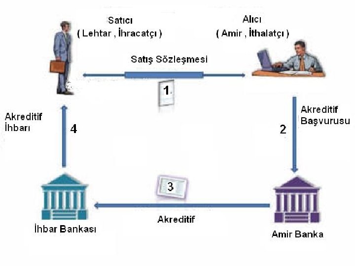 AKREDİTİF (Letter of Credit) � � � ◦ ◦ İhraç edilen malların bedellerinin ödenmesi konusunda belirli şartların yerine getirilmesinden sonra ödemenin yapılacağına ilişkin bir çeşit teminattır. Dış ticarette yaygın olarak kullanılan bir ödeme yöntemidir. Ödeme sürecine banka itibarını katarak satıcı ve alıcı arasında söz konusu olabilecek karşılıklı güvensizliği ortadan kaldıran bir yöntemdir. Akreditif de dört taraf vardır: Amir (İthalatçı) Amir Banka (İthalatçının bankası) Lehtar (İhracatçı) Lehtar Banka (İhracatçının bankası)
