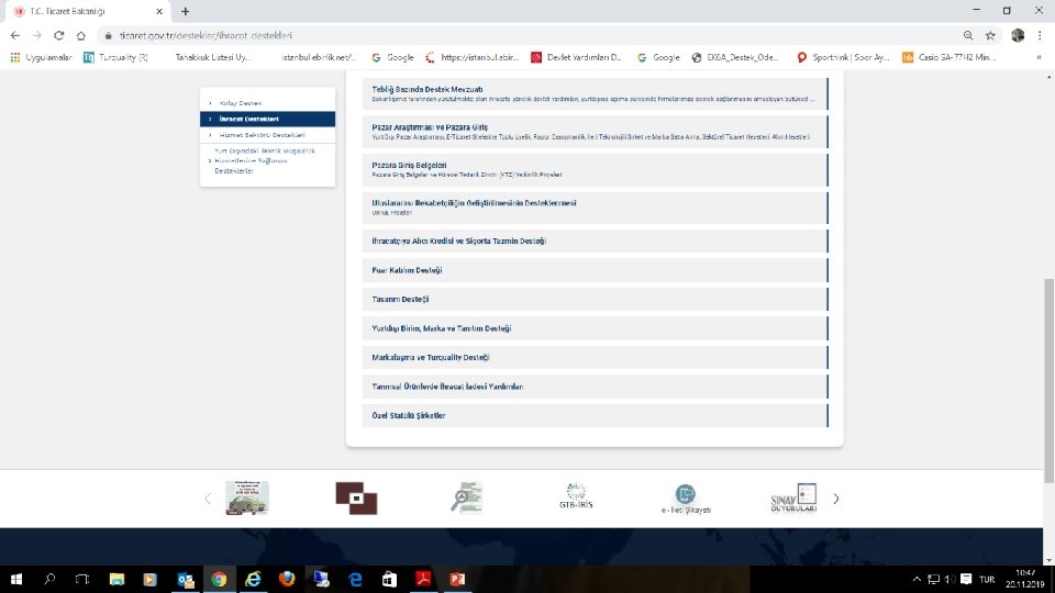 MAL İHRACATINA YÖNELİK DESTEKLER İhracata Hazırlık/Kurumsal Kapasite Oluşturma Destekleri • UR-GE • Pazar Araştırması, Rapor Pazarlama/Tutundurma Destekleri • Pazara Giriş Belgeleri • Yurtdışı Şirket Alım, Sektörel Ticaret ve Alım Heyetleri, E-Ticaret Sitelerine Üyelik • Yurt Dışı Birim, Marka Tescil ve Tanıtım • Türkiye Ticaret Merkezleri • Küresel Tedarik Zinciri • Eximbank Finansmanın Kolaylaştırılması • Fuarlara Katılım Yüksek Katma Değere Yönelik Destekler • Tasarım • Marka – Turquality 3