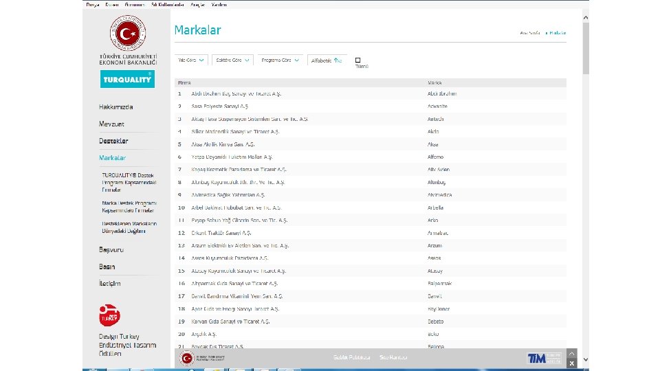 KAPSAMDAKİ FİRMALAR 2006/4 Sayılı Tebliğ kapsamında; 166 Firmanın 177 Markası TQ 109 Firmanın 110 Markası Marka Programında Desteklenmektedir.