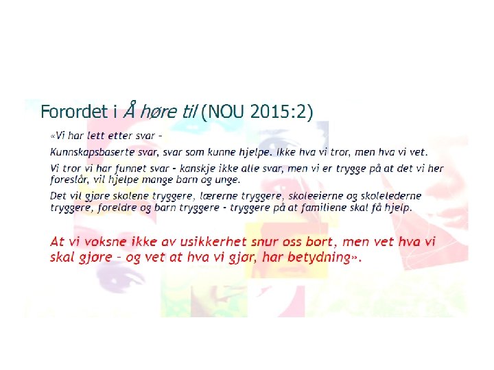 Erfaringer • Lagt for liten vekt på tilskuerrollen • For liten vekt på krenkelser – « Harde nøtter og blinde flekker» Eriksen og Lyng, NOVA – rapporten 2015. • For lite konsistente systemer • Kunnskapen må forankres i barnehager- og skole og PPT • Foreldre og elever for lite inkludert