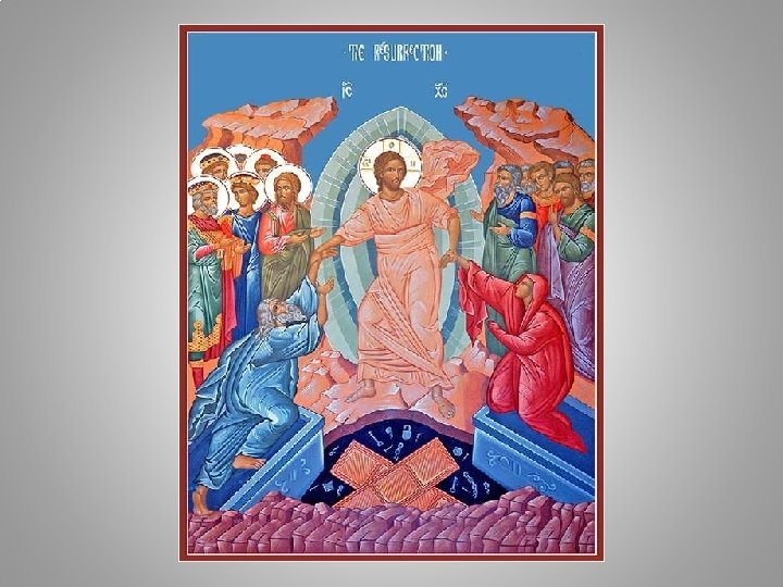 fie ridicându-l pe Adam cu dreapta, iar în mâna stângă ţinând un sul. Aceasta este întâlnirea tulburătoare dintre Adam cel vechi şi Hristos – Adam cel Nou. • Filacterul (sulul) din mâna Mântuitorului simbolizează propovăduirea Învierii făcută „duhurilor ţinute în închisoare” (1 Petru 3, 19) Atunci când este desfăşurat, filacterul poartă înscrisul: „Zapisul lui Adam e rupt, puterea iadului este sfărâmată”.