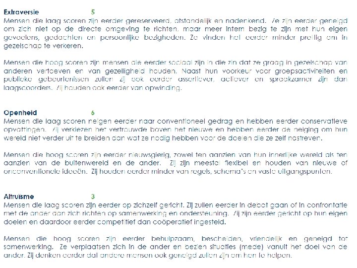 Voorbeeld 3 Myers-Briggs Type Indicator (MBTI®) Sociale interactie • Extravert of introvert (E of I) Voorkeur voor het verzamelen van gegevens • Aftastend of intuïtief (S of N) Voorkeur beslissingsproces Stijl beslissingen nemen • Gevoel of rationeel (F of T) • Opmerkzaam of oordelend (P of J) Veel gebruikt, minder wetenschappelijk onderbouwd