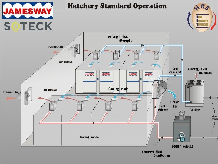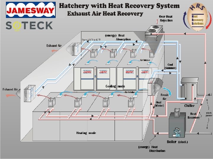 Why the HRS system? • Reuse the heat generated by old embryo to heat young embryo • Heat and cool incubator and hatcher at the same time. • Makes energy savings all year long. • Redundancy for chiller and boiler