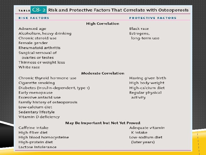 TOWARD PREVENTION – UNDERSTANDING THE CAUSES OF OSTEOPOROSIS Causes: Gender Advanced age Genetics Environment Poor calcium and vitamin D nutrition Estrogen deficiency in women Lack of physical activity Being underweight Use of tobacco and abuse of alcohol Possibly, excess protein, sodium, caffeine, and soft drinks; and inadequate protein, vitamin K, and other nutrients