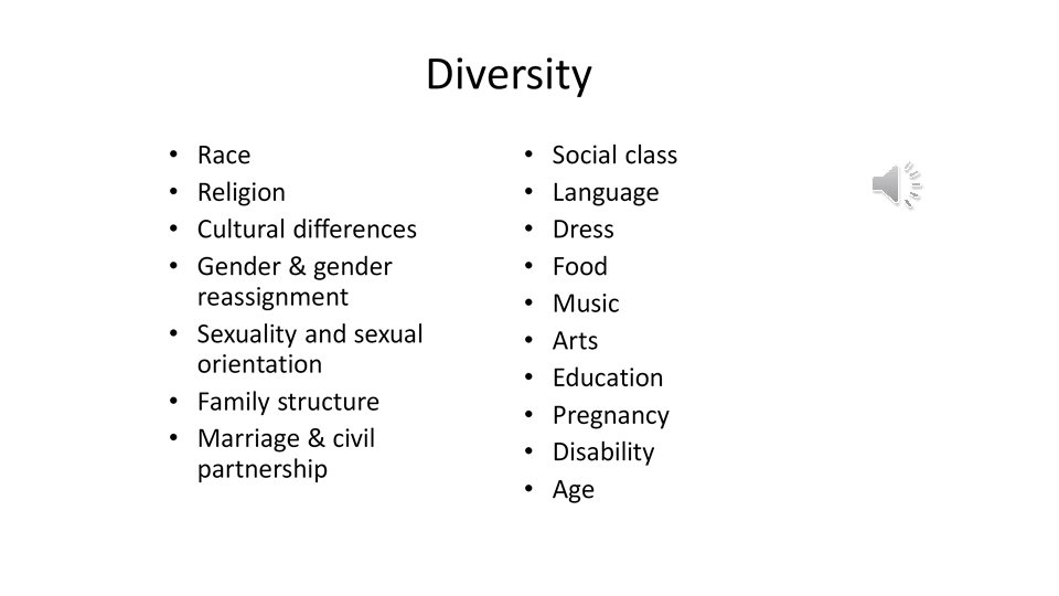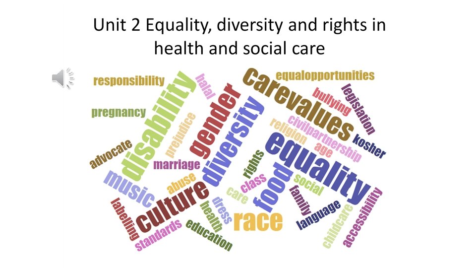 For LFu Unit 2: Equality, diversity and rights in health and social care – Define the following words: • • • • Equality Diversity Race Religion Culture Sexual orientation Class Rights Empowerment Independence Inclusion Respect Dignity Create a collage showing as many diverse elements of British society as you can find. You could use images from the internet and make sure you have a printout of the finished work. Select 5 of the individuals from your collage and describe the types of health and/or social needs they may have for example children may need vaccinations and milestone checks, pregnant women need antenatal care etc Outline any difficulties they may encounter trying to get these needs met – think about different cultures, language barriers, prejudice etc.