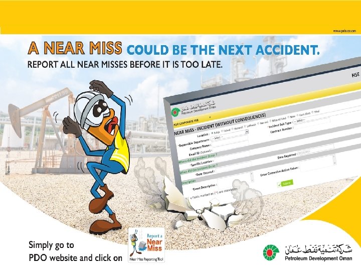2017 Timeline MDIRC Thematic Near miss presentation to MDIRC Jan Feb Engagement GD and MSEM engagement on Near Miss updates and progress HSE Manager Forum engagement on the new version and way forward Mar Tool Enhancement Reporting tool enhanced based on collective feedback from stakeholders Apr Thematic Awareness Training Interior visit for Near Miss Awareness Training (can be included in Hazard Hunt visits) May Launch Handover Near Miss Reporting Tool version 2. 0 introduced to PDO Handover of the system to MSE 3 team Jun Near Miss thematic analysis and presentation to MSEM / MDIRC Jul Aug Awareness Training Interior visit for Near Miss Awareness Training (can be included in Hazard Hunt visits) Weekly review and screening of the near miss report 10