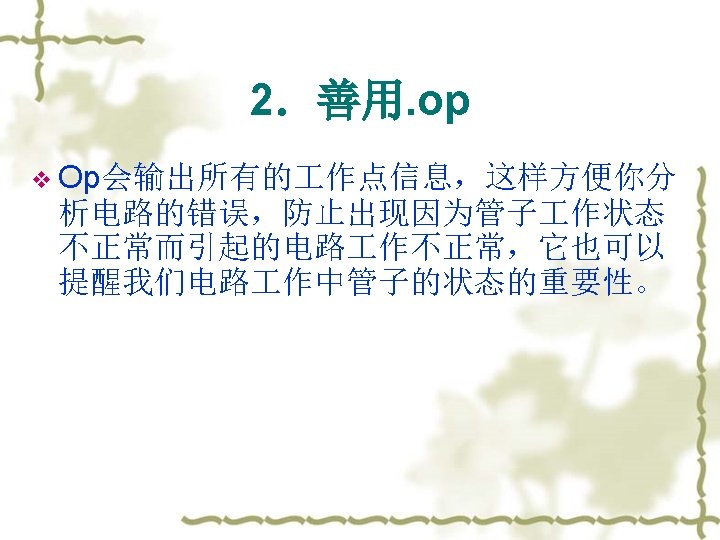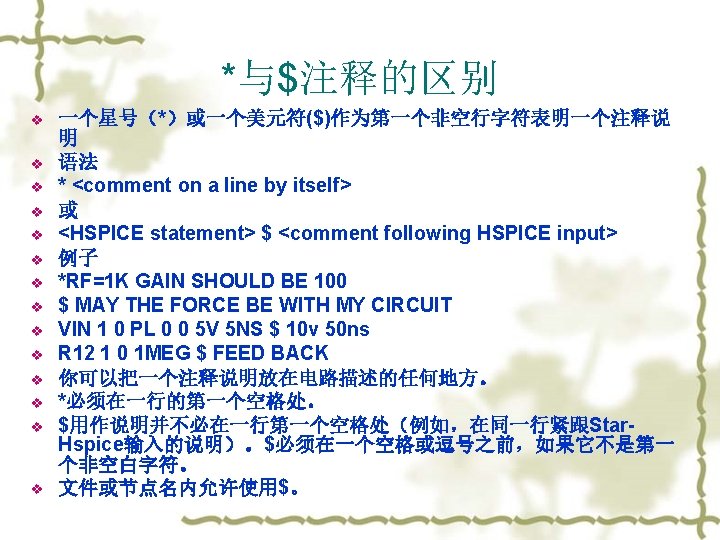 1. The most important rules v no duplicate nodes 不能重复定义节点 v zero for your ground node 地确定是 0 v no floating nodes 不要有悬空节点