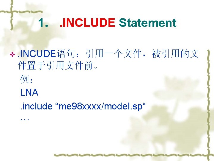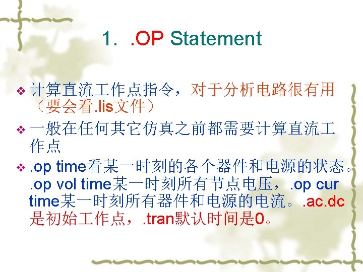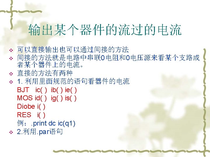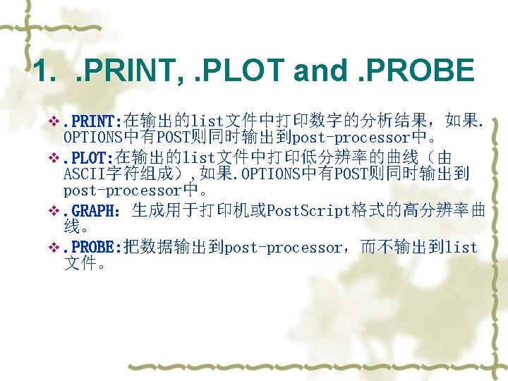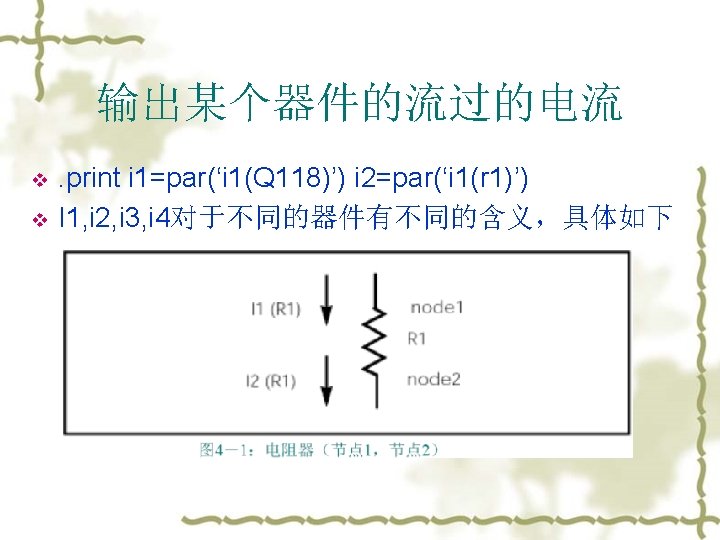 . PRINT, . PLOT and. PROBE v Examples: v. PLOT DC V(1, 2) V(3) I(Vmeas) v. PRINT TRAN V(3, 1) I(Vmeas) v. PLOT AC VM(3, 0) VDB(4, 2) VM(2, 1) VP(3, 1) IR(V 2) v 注意:使用par计算参数的值 例:print dc i 1=par(‘V(X 1. node 3)’)