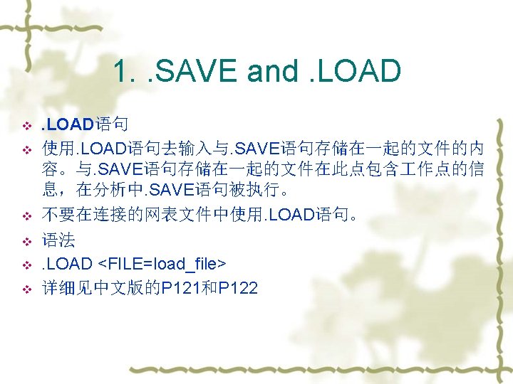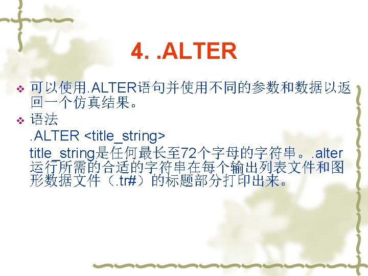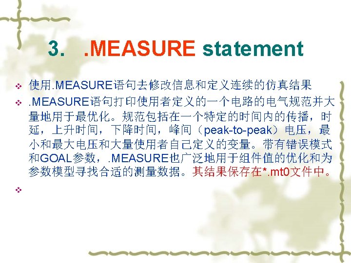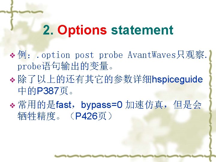 2. Options statement v . OPTIONS: 该语句允许用户重新设置程序的参数或控制程序的功能。常用的一 些如下: node: 列出个节点的元件端点,便于查错; post: 使输出数据可以使用 Avant. Waves 浏览(即将数据输出 到post processor; list: 列出元件列表; MEASDGT:. MEASURE语句输出的有效数字位数 v 语法:MEASDGT = x,The value of x is typically between 1 and 7, although youcan set it as high as 10. The default value is 4. 0.