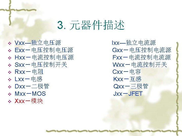 3. 元器件描述(续) --几种常用电源 v Sinusoidal sources Vname N 1 N 2 SIN(VO VA FREQ TD THETA PHASE) Vname = VO + VA exp[-THETA. (t - TD)] sin[2 pi. f (t - TD) + (Phase/360)] v PWL Vname N 1 N 2 PWL(T 1 V 1 T 2 V 2 T 3 V 3. . . ) Example: Vgpwl 1 2 PWL(0 0 10 U 5 100 U 5 110 U 0) r 间隔时间 v Pulse Vname N 1 N 2 PULSE(V 1 V 2 TD Tr Tf PW Period)
