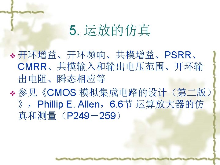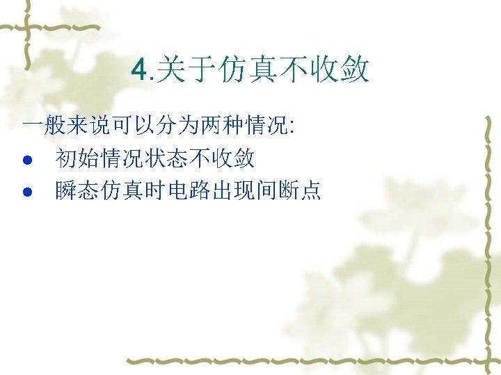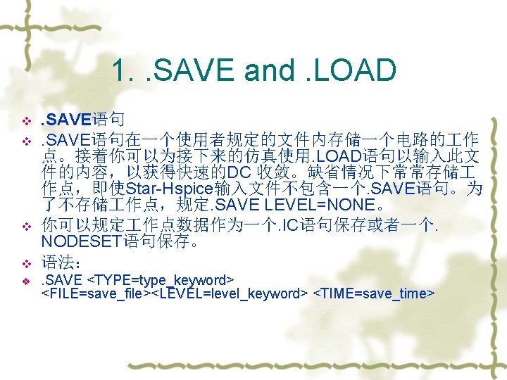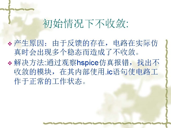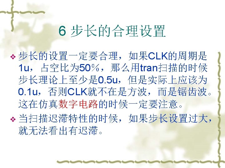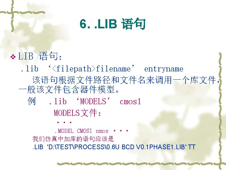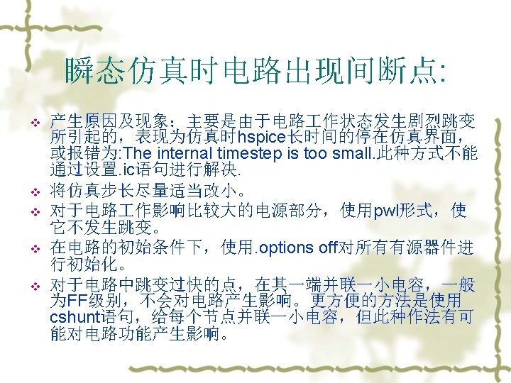 3. 常见的错误 v v Failure to converge (OP and DC) – The DC solver uses an iterative method to find the operating point, but some circuits exist which have no or multiple operating points. The best solution is to perform hand analysis of your circuit to make sure that you haven’t done this. No DC Path to ground (OP and DC) – This often happens with floating MOSFET gates. Just add a resistor between the node and ground, or use the. IC or. NODESET commands to create an initial condition. Be warned, however, that. NODESET and. IC can cause convergence problems. Stability Problems (TRAN) – Sometimes a transient analysis shows a “ringing” or oscillation that shouldn’t be there. This can often be solved by reducing the maximum time step or using slower rise and fall times for independent sources. 注意:不要把HSPICE的lib和要仿真的网表放在中文目录下,或者把网 表名改成中文名。