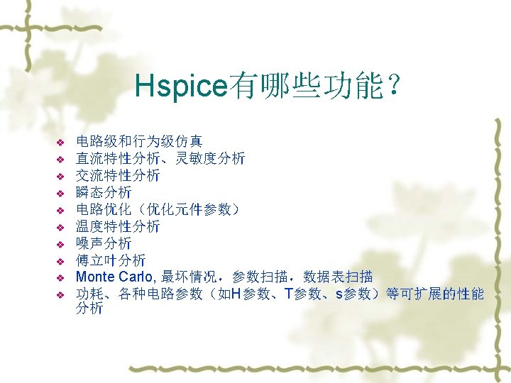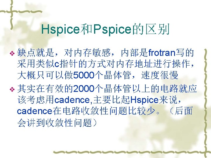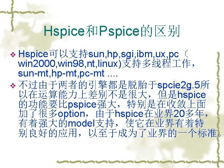 一. HSPICE 简介 v SPICE (Simulation Program for Integrated Circuits Emphasis) v PSpice (Micro. Sim Corp. ) ——PC version of SPICE v HSpice (Avant!. ) ——runs on workstations and larger computers