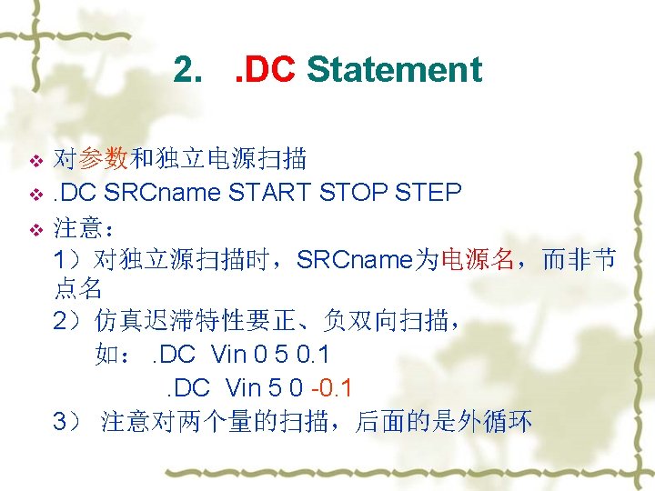 . DC对参数的扫描 v 例如:vin 1 2 dc H 1 . param H 1=10 v . dc H 1 0 20 1 v 对温度的扫描: . dc temp -20 80 1