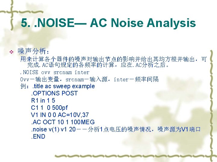 Ac type 一共有4种 DEC – decade variation. OCT – octave variation. LIN – linear variation. POI – list of points. v 例如. AC DEC 10 1 K 100 MEG. AC LIN 100 1 100 HZ. AC DEC 10 1 10 K SWEEP cload LIN 20 1 pf 10 pf. AC DEC 10 1 10 K SWEEP rx POI 2 5 k 15 k v