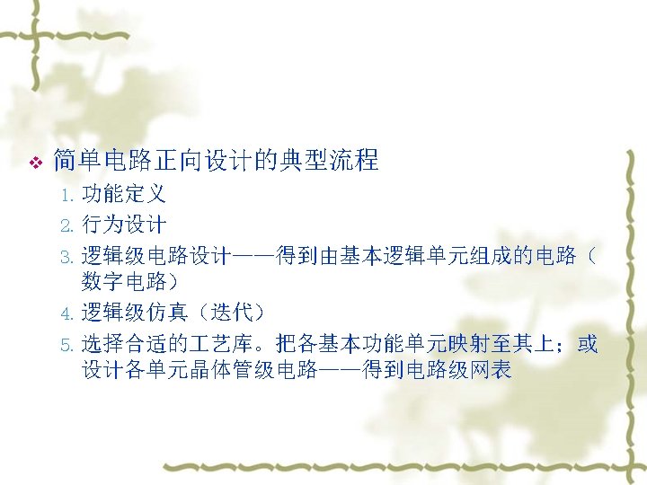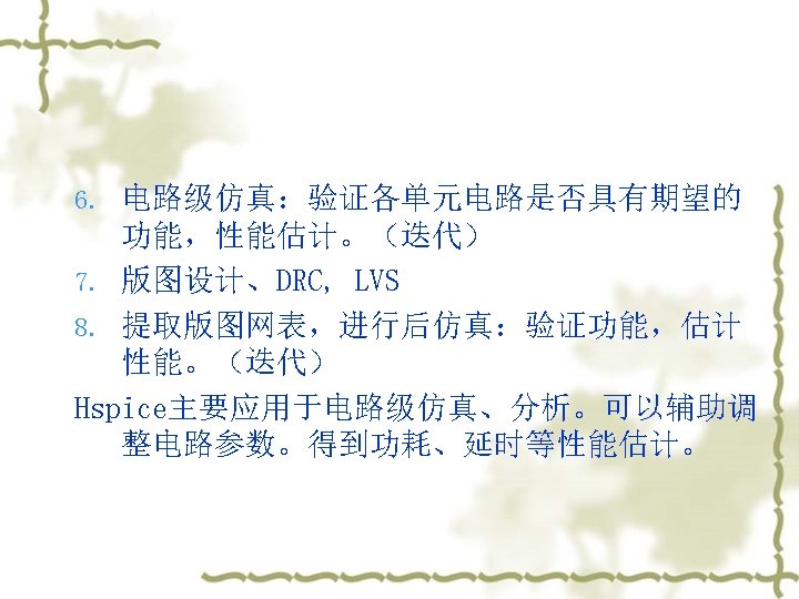4. 子电路 v v v v 下面是由前面举例的CMOS反相器组成的 三级反相器链网表: ……. global vdd. SUBCKT INV IN OUT wn=1. 2 u wp=1. 2 u Mn out in 0 0 NMOS W=wn L=1. 2 u Mp out in vdd PMOS W=wp L=1. 2 u. ENDS X 1 INV WN=1. 2 U WP=3 U X 2 1 2 INV WN=1. 2 U WP=3 U X 3 2 OUT INV WN=1. 2 U WP=3 U CL OUT 0 1 PF VCC VDD 0 5 V ……