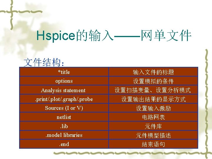二. 词法 v v v v 1. 不区分大小写(case insensitive) 2. 标题行——第一行 3. 注释:* or $ 4. 续接符:+ 5. 非线性器件要用. MODEL statement. 6. 0, GND!, GROUND 表示全局地. 7. 表示数量的词尾: T(= 1 E 12 or 10+12); G(= E 9); MEG(= E 6); K(= E 3); M(= E-3); U(= E-6); N(= E-9); P(= E-12), and F(= E-15),默认是 国际单位。(关键不要搞错M和MEG) 8. Output variables:(后面会有详细的讲解) Voltage between two nodes: v(n 1, n 2) Voltage of a node relative to ground: v(n 1) Current through an independent source: i(vin)