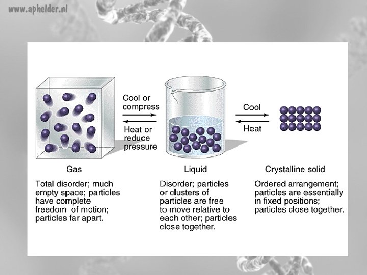 Moleculen bij een fasenovergang • Veranderen de moleculen? NEE!!! • Wat gebeurt er met de moleculen? – Ze raken verder van elkaar af of komen dichter bij elkaar. – De onderlinge aantrekkingskracht wordt groter of kleiner