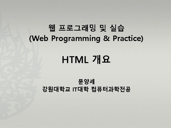 첫 번째 HTML 문서 HTML 개요 메모장을 열고 다음과 같이 입력하고 first. html로 저장 <html> <head> <title>간단한 실습</title> </head> <body> 안녕하세요? 첫 번째 실습입니다. </body> </html> Page 20 Web Programming & Practice by Yang-Sae Moon