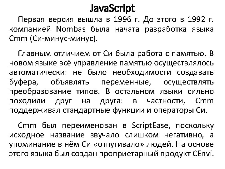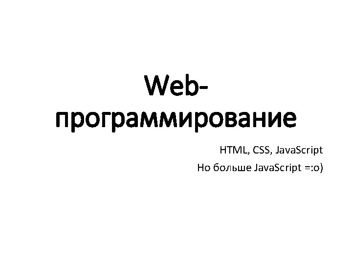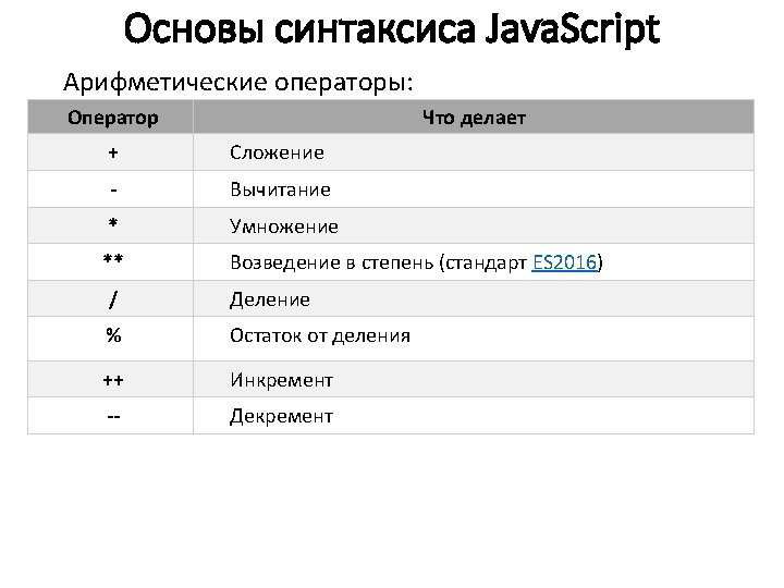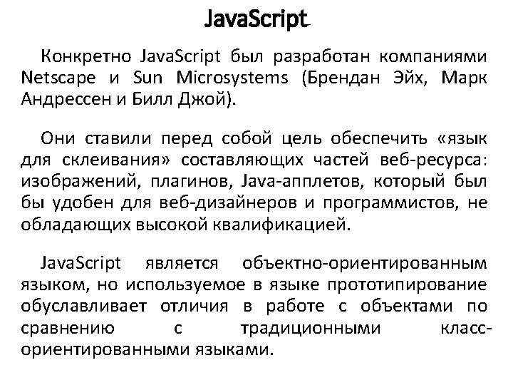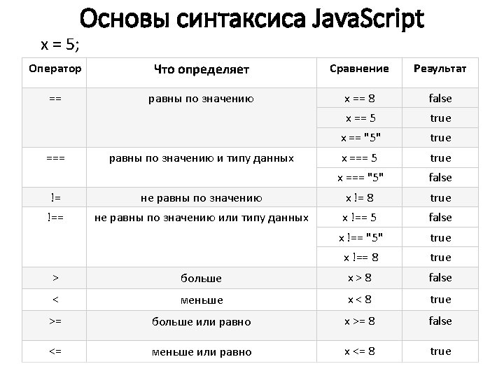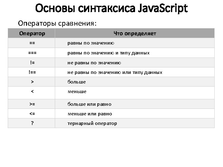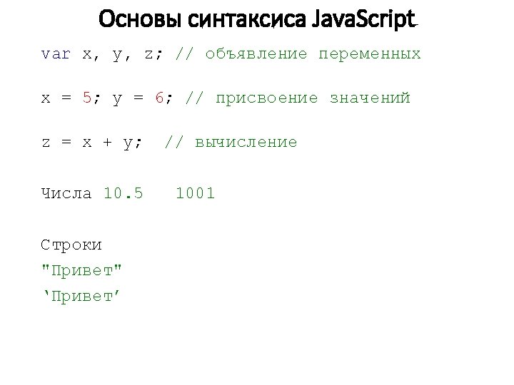 Основы синтаксиса Java. Script Типы данных: var length = 16; var last. Name = "Johnson"; var x = {first. Name: "John", last. Name: "Doe"}; // Number // String // Object var x = 16 + "Volvo"; //var x = "16" + "Volvo"; var x = 16 + 4 + "Volvo"; //20 Volvo var x = "Volvo" + 16 + 4; //Volvo 164 var x; x = 5; x = "John"; // тип и значение x не определено // x – число // x – строка var answer 1 = "It's alright"; var answer 2 = "He is called 'Johnny'"; var answer 3 = 'He is called "Johnny"'; var cars = ["Saab", "Volvo", "BMW"]; // массив
