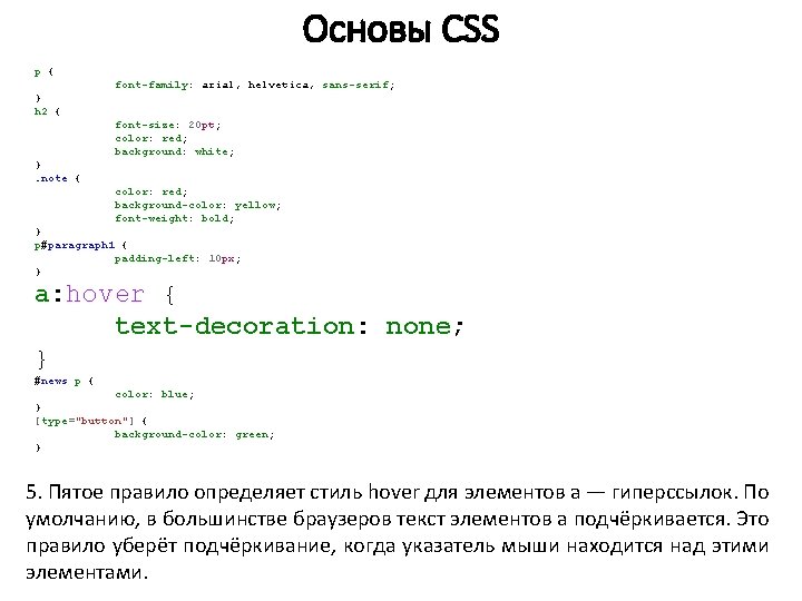 Основы CSS p { font-family: arial, helvetica, sans-serif; } h 2 { font-size: 20 pt; color: red; background: white; }. note { color: red; background-color: yellow; font-weight: bold; } p#paragraph 1 { padding-left: 10 px; } a: hover { text-decoration: none; } #news p { color: blue; } [type="button"] { background-color: green; } 4. Четвёртое правило будет применяться только к элементу p, атрибут id которого равен paragraph 1. Такой элемент будет иметь внутренний отступ в 10 пикселей (padding).