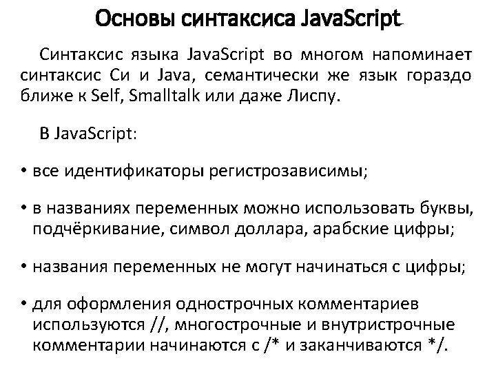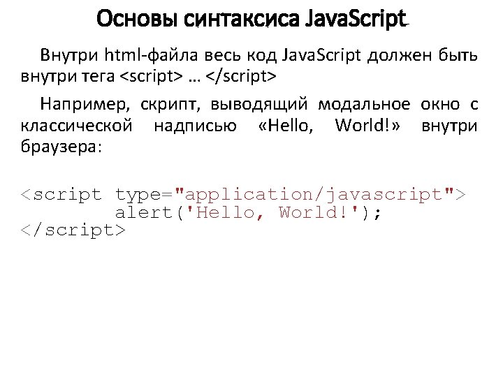 Основы синтаксиса Java. Script <p id="demo"> </p> <script> var car. Name = "Volvo"; document. get. Element. By. Id("demo"). inner. HTML = car. Name; </script>