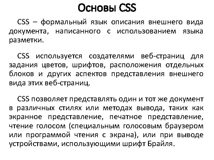 Основы CSS p { font-family: arial, helvetica, sans-serif; } h 2 { font-size: 20 pt; color: red; background: white; }. note { color: red; background-color: yellow; font-weight: bold; } p#paragraph 1 { padding-left: 10 px; } a: hover { text-decoration: none; } #news p { color: blue; } [type="button"] { background-color: green; } 1. Первое правило присвоено HTML-элементу p (абзацу) — назначен стиль. Абзацы будут отображаться шрифтом Arial или, если такой шрифт недоступен, тогда Helvetica или Sans-serif, иначе, другим шрифтом этого семейства.