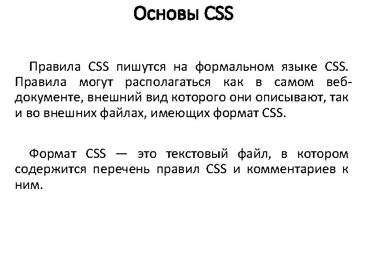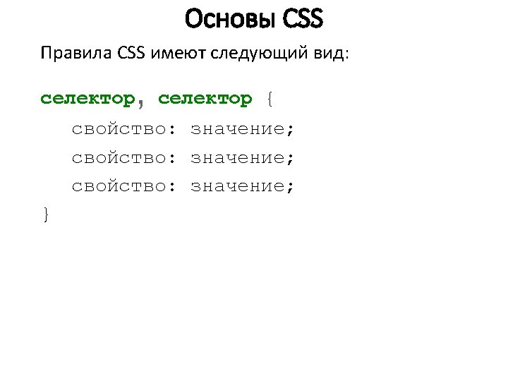 Основы CSS p { font-family: arial, helvetica, sans-serif; } h 2 { font-size: 20 pt; color: red; background: white; }. note { color: red; background-color: yellow; font-weight: bold; } p#paragraph 1 { padding-left: 10 px; } a: hover { text-decoration: none; } #news p { color: blue; } [type="button"] { background-color: green; } 2. Второе правило присвоено HTML-элементу h 2 (заголовку второго уровня). Заголовок второго уровня будет отображаться красным на белом фоне с увеличенным размером.