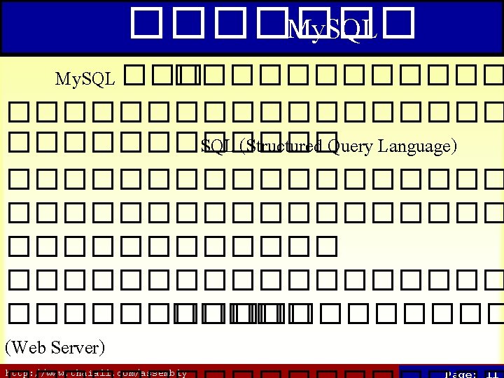 ����� SQL ������ (SQL) ���������� ����������������� ��������� Donald D. Chamberlin and Raymond F. Boyce ��� IBM ������� 1970 ����. 1 create table a (a 1 int, a 2 char(20)); ����� http: //en. wikipedia. org/wiki/SQL 2. insert into a values (1, "abc"); http: //www. thaiall. com/assembly Page: 10