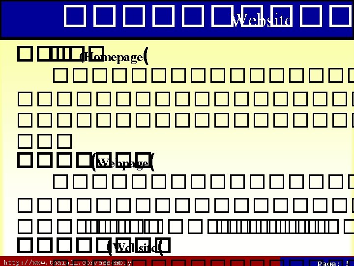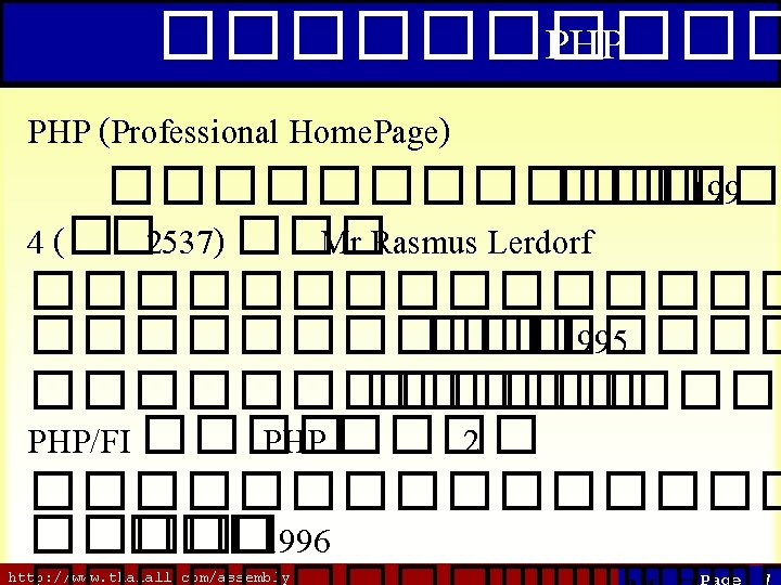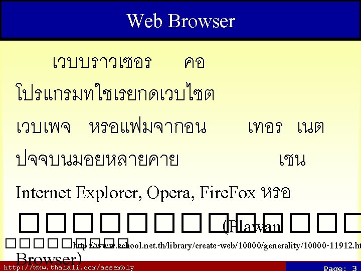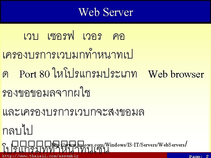 ����� HTML (Hyper. Text Markup Language) ���������������� ��� ������� �� (Tim Berners Lee) �� ���. �. 1990 HTML �������� World ����� http: //inventors. about. com/od/computersoftware/a/html. htm Wide Web Consortium ����� W 3 C http: //www. thaiall. com/assembly Page: 6