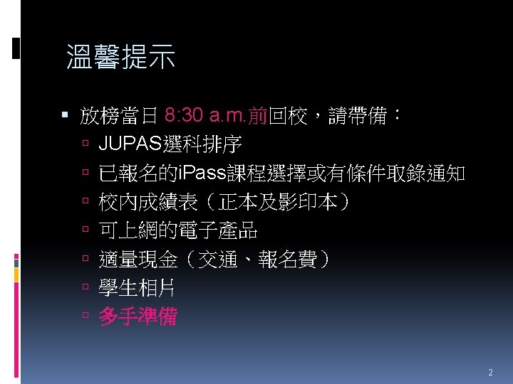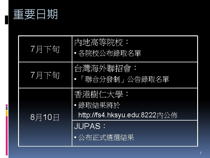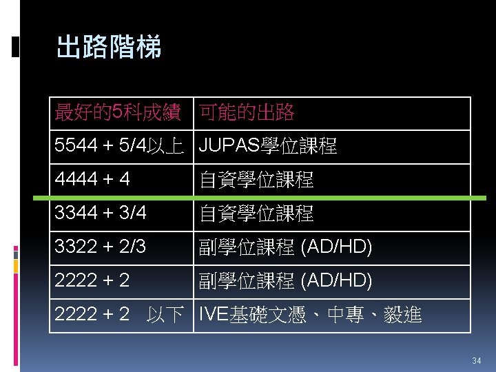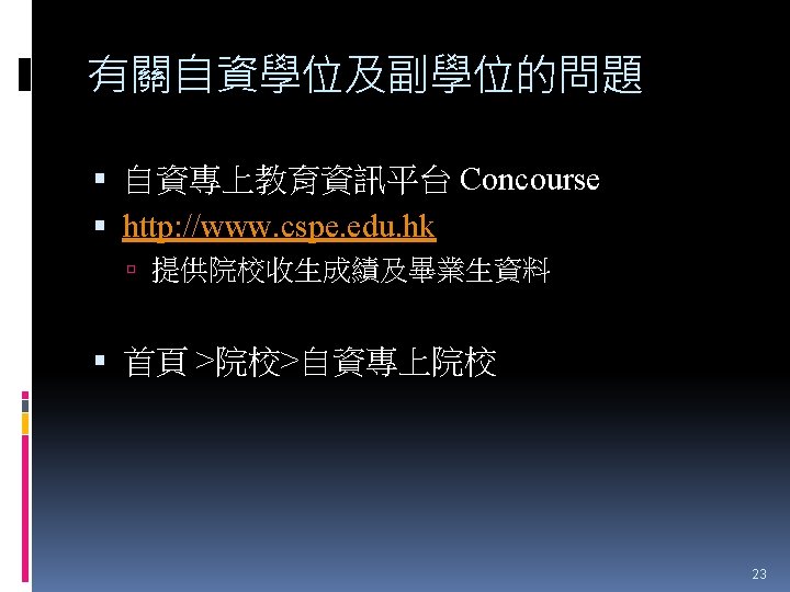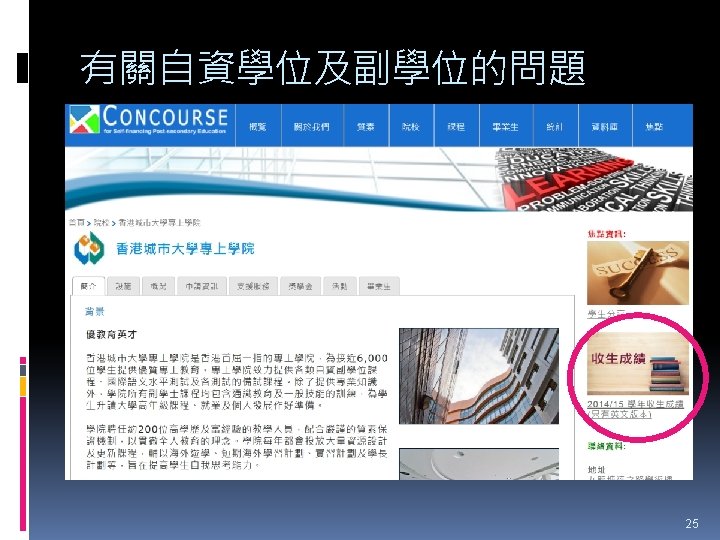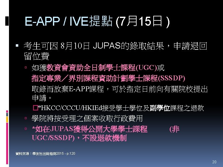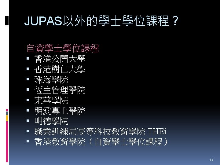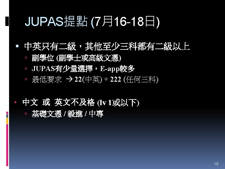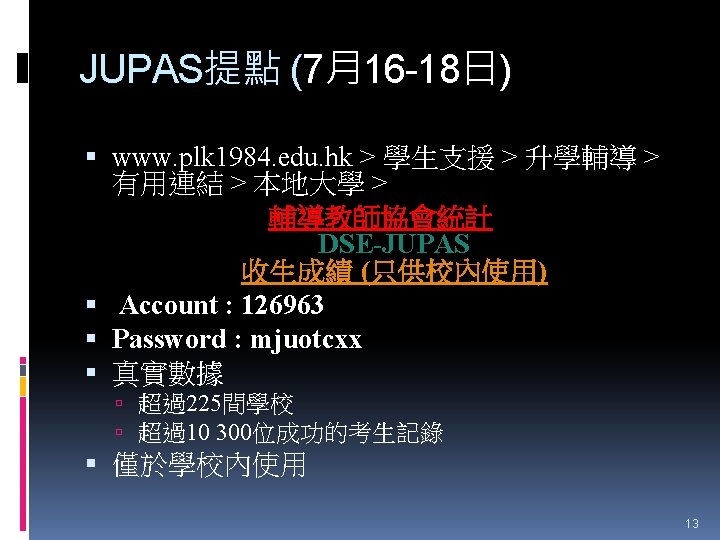 HTShum 2015 HKDSE DSE 2015 HKDSE 1 Dress Slides: 71 Download presentation HTShum 2015 HKDSE放榜提點 中六DSE - 2015 HKDSE放榜提點 1 Dress Code? http: //undergrad. bm. ust. hk/eng/why/publications/buzz_10 aug. pdf 2014 DSE表現 3322 + 2: 40. 1% 26 202人 2014 HKDSE考生數目: 79 572人 學位: 考生出路 15 160資助 + 7000自資 + 3400內地 >22222: 66. 7% 43538人 副學位: <22222: 33. 3% ~21732人 毅進/職業訓練 ~38300 >20000 42 Gear Up! Your future is not destined. Appendix e導航課程搜尋 具 http: //enavigator. edb. hkedcity. net 55 Appendix 中學畢業生升學輔導手冊2015 http: //www. cspe. edu. hk/content/Resources-Career. Guidance-Handbook 56 Appendix 放榜指南針 http: //334. edb. hkedcity. net/715/ doc/compass 715. pdf 57 Appendix http: //334. edb. hkedcity. net/715/ Appendix JUPAS及Non-JUPAS收生人數 學年 入學 途徑 城大 浸大 嶺大 中大 教院 理大 科大 港大 總計 聯招 1689 1051 499 2510 680 1871 1558 1986 (79. 9%) (83. 9%) (89. 4%) (86. 4%) (82. 6%) (80. 5%) (84. 3%) (75. 8%) 11844 (82. 0%) 非聯招 425 201 59 396 143 454 291 634 (20. 1%) (16. 1%) (10. 6%) (13. 6%) (17. 4%) (19. 5%) (15. 7%) (24. 2%) 2603 (18. 0%) 聯招 1633 1026 497 2443 526 1950 1548 1978 (79. 5%) (81. 7%) (91. 4%) (82. 8%) (81. 2%) (78. 5%) (87. 3%) (76. 1%) 11601 (81. 1%) 非聯招 421 230 47 506 122 534 226 620 (20. 5%) (18. 3%) (8. 6%) (17. 2%) (18. 8%) (21. 5%) (12. 7%) (23. 9%) 2706 (18. 9%) 聯招 1227 1936 525 2889 757 2324 1796 2142 (100. 0% (93. 2%) (99. 4%) (93. 7%) (99. 9%) (97. 8%) (75. 8%) ) 13596 (92. 7%) 141 (6. 8%) 1066 (7. 3%) 2011/12 2012/13 (三年制課程) 2012/13 (四年制課程) 非聯招 - 3 195 (0. 6%) (6. 3%) 2 (0. 3%) 3 (0. 1%) 40 (2. 2%) 682 (24. 2%) 59 Appendix VTC取錄流程表 60 Appendix Admission Formula (Sub Weighting) JUPAS大學收生計法 個別院校及學系各有不同 例子 - 理大 4 C+1 X Account Applied Bio Chem Tech Fashion and Textile Social work Etc… Best 5 Engineering Hotel Management Surveying Computing Radiography Etc… 2 C+best 3 Design Nursing Occupational therapy Etc… Source: http: //www. polyu. edu. hk/as/ep_ft/avg-dse-scores. pdf 68 Appendix Admission Formula (Sub Weighting) 收生分數參考 1. http: //www. jupas. edu. hk/upload/useful_mater ial/af_2014. pdf 2. http: //www. jupas. edu. hk/upload/useful_mater ial/af_2013. pdf 3. www. plk 1984. edu. hk > 學生支援 > 升學輔 導 > 有用連結 > 本地大學 > 輔導教師協會統計 DSE-JUPAS 69 Appendix Admission Formula (Sub Weighting) 以下院校有提供清晰的計分方程 City http: //www. admo. cityu. edu. hk/jupas_hkdse/assessment/ CU http: //www 5. cuhk. edu. hk/oafa/index. php/jupas-4 -year- cohort-3/programme-information/39 -jupas/394 -calculationof-admission-scores HKUST http: //join. ust. hk/local/jupas/apply_jupas_entry_subject. html Poly http: //www. polyu. edu. hk/as/hkdse/faq. html http: //www 38. polyu. edu. hk/aseprospectus/jsp/misc_bookmar k. jsp? cms_menu_id=8030&website. Id=1&scheme. Id=201310 &lang. Id=1 70