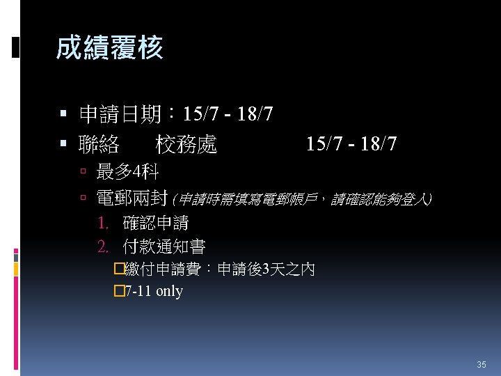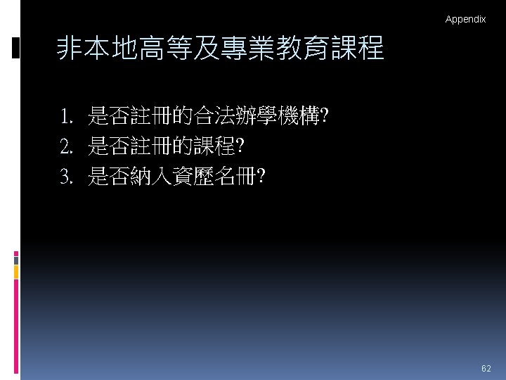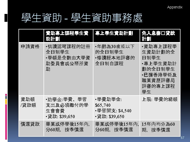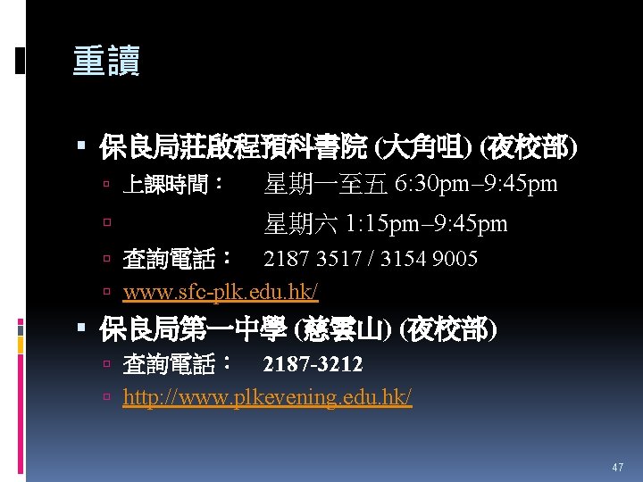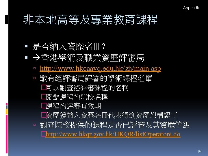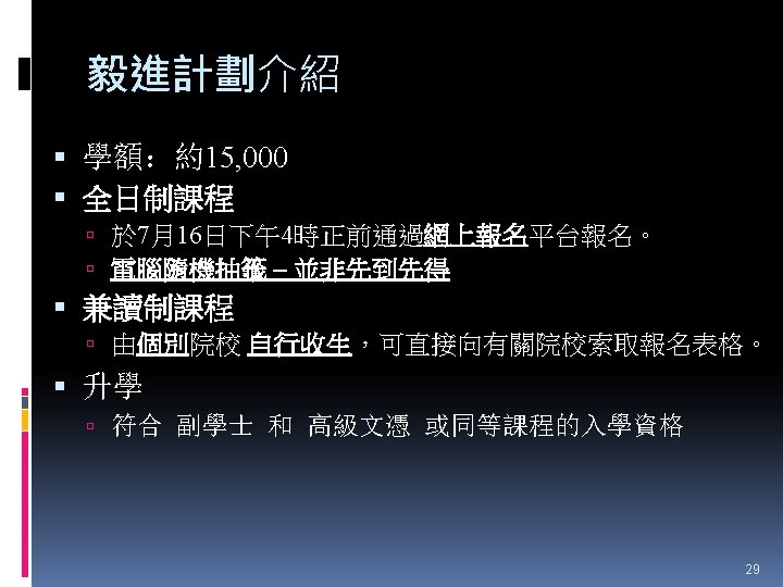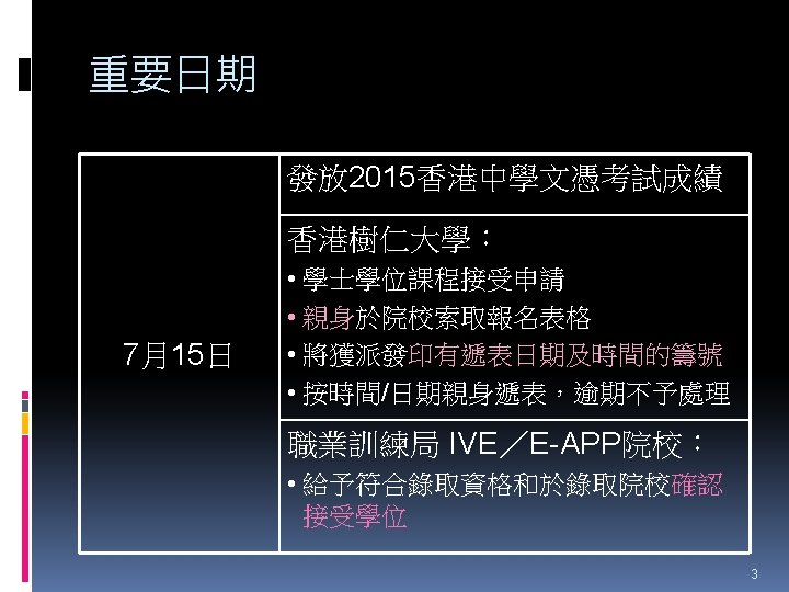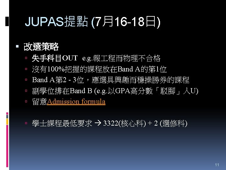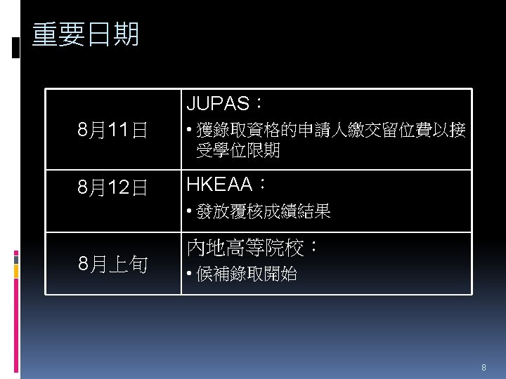 HTShum 2015 HKDSE DSE 2015 HKDSE 1 Dress Slides: 71 Download presentation HTShum 2015 HKDSE放榜提點 中六DSE - 2015 HKDSE放榜提點 1 Dress Code? http: //undergrad. bm. ust. hk/eng/why/publications/buzz_10 aug. pdf 2014 DSE表現 3322 + 2: 40. 1% 26 202人 2014 HKDSE考生數目: 79 572人 學位: 考生出路 15 160資助 + 7000自資 + 3400內地 >22222: 66. 7% 43538人 副學位: <22222: 33. 3% ~21732人 毅進/職業訓練 ~38300 >20000 42 Gear Up! Your future is not destined. Appendix e導航課程搜尋 具 http: //enavigator. edb. hkedcity. net 55 Appendix 中學畢業生升學輔導手冊2015 http: //www. cspe. edu. hk/content/Resources-Career. Guidance-Handbook 56 Appendix 放榜指南針 http: //334. edb. hkedcity. net/715/ doc/compass 715. pdf 57 Appendix http: //334. edb. hkedcity. net/715/ Appendix JUPAS及Non-JUPAS收生人數 學年 入學 途徑 城大 浸大 嶺大 中大 教院 理大 科大 港大 總計 聯招 1689 1051 499 2510 680 1871 1558 1986 (79. 9%) (83. 9%) (89. 4%) (86. 4%) (82. 6%) (80. 5%) (84. 3%) (75. 8%) 11844 (82. 0%) 非聯招 425 201 59 396 143 454 291 634 (20. 1%) (16. 1%) (10. 6%) (13. 6%) (17. 4%) (19. 5%) (15. 7%) (24. 2%) 2603 (18. 0%) 聯招 1633 1026 497 2443 526 1950 1548 1978 (79. 5%) (81. 7%) (91. 4%) (82. 8%) (81. 2%) (78. 5%) (87. 3%) (76. 1%) 11601 (81. 1%) 非聯招 421 230 47 506 122 534 226 620 (20. 5%) (18. 3%) (8. 6%) (17. 2%) (18. 8%) (21. 5%) (12. 7%) (23. 9%) 2706 (18. 9%) 聯招 1227 1936 525 2889 757 2324 1796 2142 (100. 0% (93. 2%) (99. 4%) (93. 7%) (99. 9%) (97. 8%) (75. 8%) ) 13596 (92. 7%) 141 (6. 8%) 1066 (7. 3%) 2011/12 2012/13 (三年制課程) 2012/13 (四年制課程) 非聯招 - 3 195 (0. 6%) (6. 3%) 2 (0. 3%) 3 (0. 1%) 40 (2. 2%) 682 (24. 2%) 59 Appendix VTC取錄流程表 60 Appendix Admission Formula (Sub Weighting) JUPAS大學收生計法 個別院校及學系各有不同 例子 - 理大 4 C+1 X Account Applied Bio Chem Tech Fashion and Textile Social work Etc… Best 5 Engineering Hotel Management Surveying Computing Radiography Etc… 2 C+best 3 Design Nursing Occupational therapy Etc… Source: http: //www. polyu. edu. hk/as/ep_ft/avg-dse-scores. pdf 68 Appendix Admission Formula (Sub Weighting) 收生分數參考 1. http: //www. jupas. edu. hk/upload/useful_mater ial/af_2014. pdf 2. http: //www. jupas. edu. hk/upload/useful_mater ial/af_2013. pdf 3. www. plk 1984. edu. hk > 學生支援 > 升學輔 導 > 有用連結 > 本地大學 > 輔導教師協會統計 DSE-JUPAS 69 Appendix Admission Formula (Sub Weighting) 以下院校有提供清晰的計分方程 City http: //www. admo. cityu. edu. hk/jupas_hkdse/assessment/ CU http: //www 5. cuhk. edu. hk/oafa/index. php/jupas-4 -year- cohort-3/programme-information/39 -jupas/394 -calculationof-admission-scores HKUST http: //join. ust. hk/local/jupas/apply_jupas_entry_subject. html Poly http: //www. polyu. edu. hk/as/hkdse/faq. html http: //www 38. polyu. edu. hk/aseprospectus/jsp/misc_bookmar k. jsp? cms_menu_id=8030&website. Id=1&scheme. Id=201310 &lang. Id=1 70