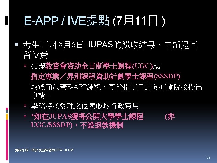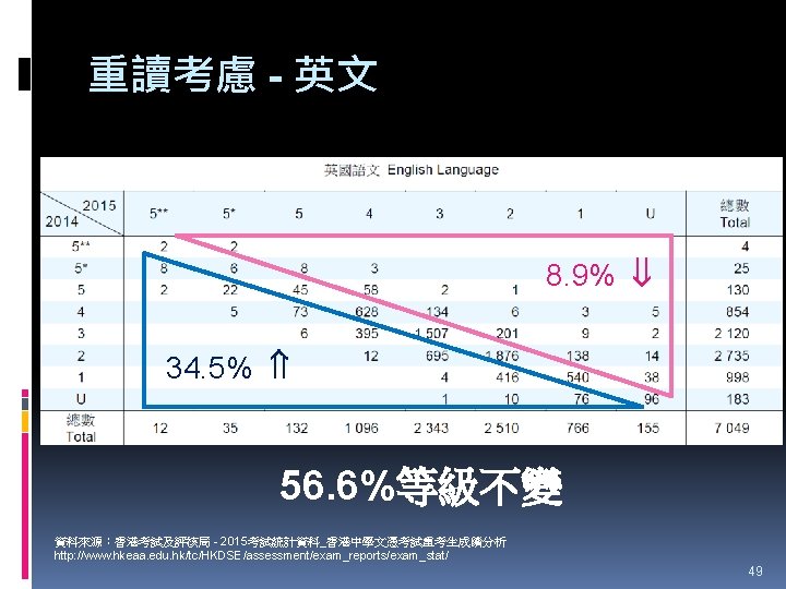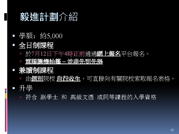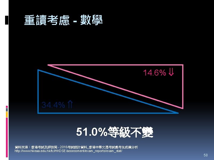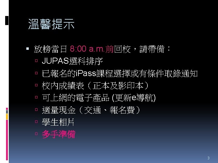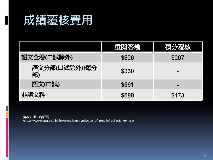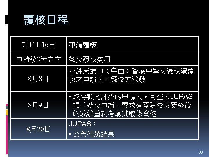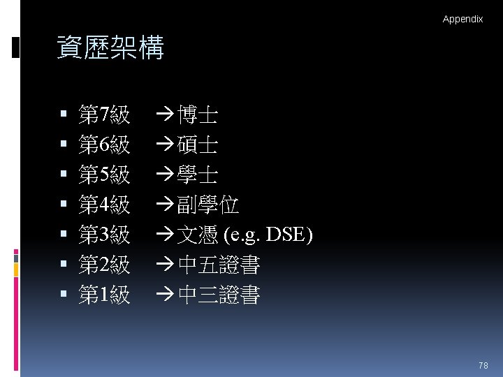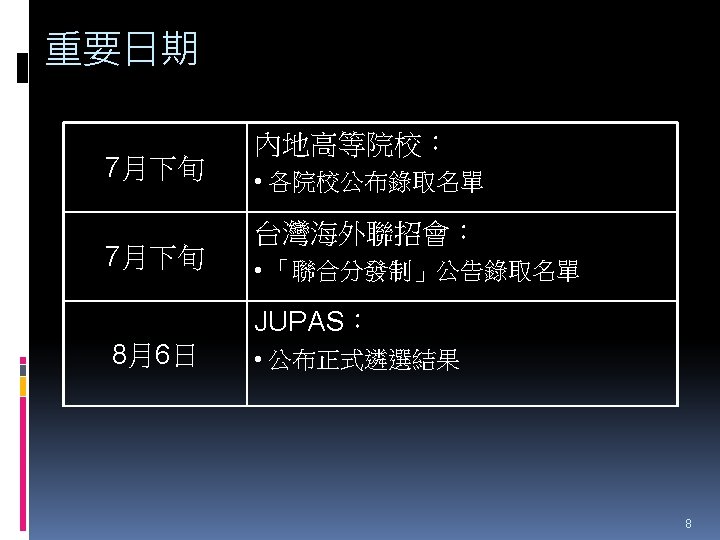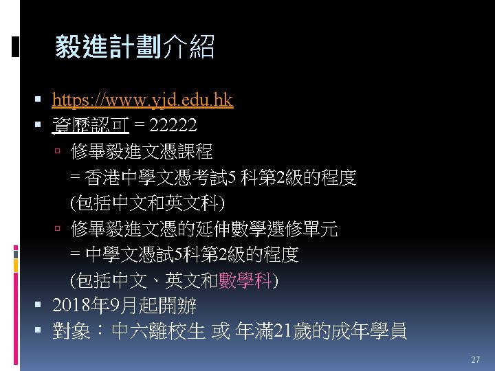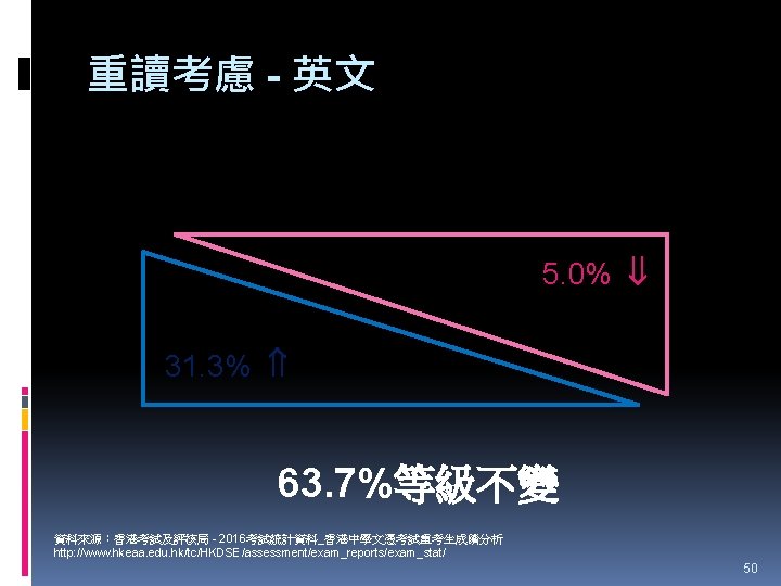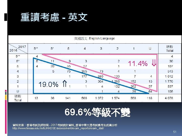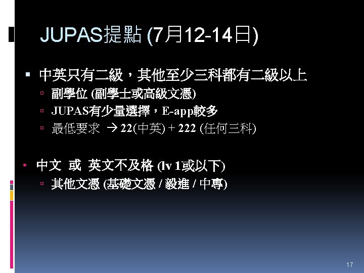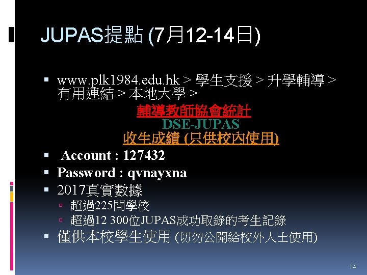 HTShum 2018 HKDSE DSE 2018 HKDSE 1 Dress Slides: 86 Download presentation HTShum 2018 HKDSE放榜提點 中六DSE - 2018 HKDSE放榜提點 1 Dress Code? http: //undergrad. bm. ust. hk/eng/why/publications/buzz_10 aug. pdf 非本地高等及專業教育課程 資料來源:教育局 https: //www. edb. gov. hk/tc/edu-system/postsecondary/non-local-higher-professional-edu/index. html/ 34 成績覆核(Appeal)成功率? 2012 DSE 覆核成功率 資料來源:考評局 -香港中學文憑考試統計概覽 http: //www. hkeaa. edu. hk/tc/HKDSE/assessment/exam_reports/exam_stat/ 39 成績覆核(Appeal)成功率? 2013 DSE 覆核成功率 資料來源:考評局 -香港中學文憑考試統計概覽 http: //www. hkeaa. edu. hk/tc/HKDSE/assessment/exam_reports/exam_stat/ 40 成績覆核(Appeal)成功率? 2014 DSE 覆核成功率 資料來源:考評局 -香港中學文憑考試統計概覽 http: //www. hkeaa. edu. hk/tc/HKDSE/assessment/exam_reports/exam_stat/ 41 成績覆核(Appeal)成功率? 2015 DSE 覆核成功率 資料來源:考評局 -香港中學文憑考試統計概覽 http: //www. hkeaa. edu. hk/tc/HKDSE/assessment/exam_reports/exam_stat/ 42 成績覆核(Appeal)成功率? 2016 DSE 覆核成功率 資料來源:考評局 -香港中學文憑考試統計概覽 http: //www. hkeaa. edu. hk/tc/HKDSE/assessment/exam_reports/exam_stat/ 43 成績覆核(Appeal)成功率? 2017 DSE 覆核成功率 資料來源:考評局 -香港中學文憑考試統計概覽 http: //www. hkeaa. edu. hk/tc/HKDSE/assessment/exam_reports/exam_stat/ 44 2017 DSE表現 3322 + 2: 41. 1% DSE表現 20 949人 >22222: 69. 8% 34 673人 <22222: 30. 2% 15 023人 2018 HKDSE考生數目: 51 675人 學位: 考生出路 15 170資助 + 8 500自資 + 3 400內地 副學位: ~30 200 毅進/職業訓練 >10 500 46 Gear Up! Your future is not destined. Appendix e導航課程搜尋 具 http: //enavigator. edb. hkedcity. net 77 Appendix Admission Formula (Sub Weighting) JUPAS大學收生計法 個別院校及學系各有不同 例子 - 理大 4 C+1 X Account Applied Bio Chem Tech Fashion and Textile Social work Etc… Best 5 Engineering Hotel Management Surveying Computing Radiography Etc… 2 C+best 3 Design Nursing Occupational therapy Etc… Source: http: //www. polyu. edu. hk/as/ep_ft/avg-dse-scores. pdf 84 Appendix Admission Formula (Sub Weighting) 收生分數參考 1. http: //www. jupas. edu. hk/upload/useful_mater ial/af_2014. pdf 2. http: //www. jupas. edu. hk/upload/useful_mater ial/af_2013. pdf 3. www. plk 1984. edu. hk > 學生支援 > 升學輔 導 > 有用連結 > 本地大學 > 輔導教師協會統計 DSE-JUPAS 85 Appendix Admission Formula (Sub Weighting) 以下院校有提供清晰的計分方程 City http: //www. admo. cityu. edu. hk/jupas_hkdse/assessment/ CU http: //www 5. cuhk. edu. hk/oafa/index. php/jupas-4 -year- cohort-3/programme-information/39 -jupas/394 -calculationof-admission-scores HKUST http: //join. ust. hk/local/jupas/apply_jupas_entry_subject. html Poly http: //www. polyu. edu. hk/as/hkdse/faq. html http: //www 38. polyu. edu. hk/aseprospectus/jsp/misc_bookmar k. jsp? cms_menu_id=8030&website. Id=1&scheme. Id=201310 &lang. Id=1 86