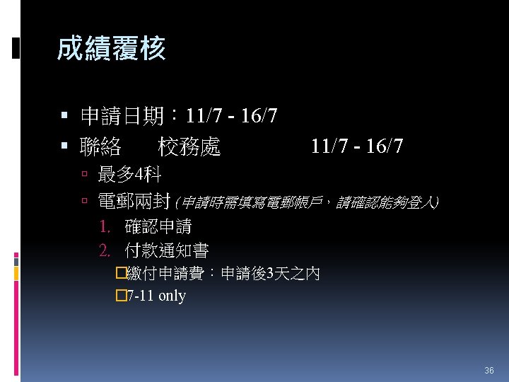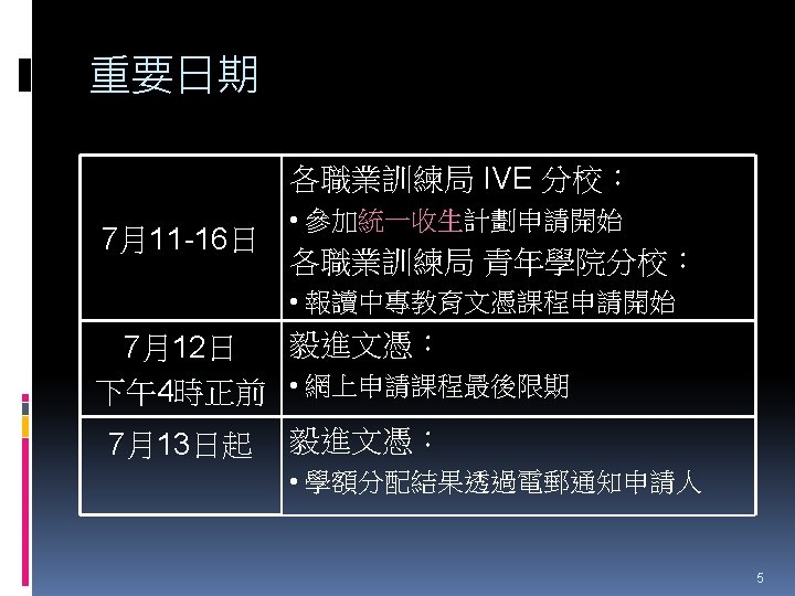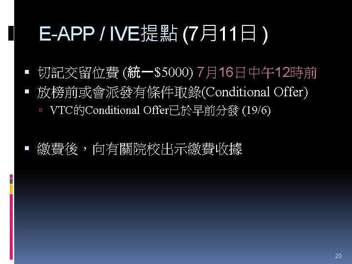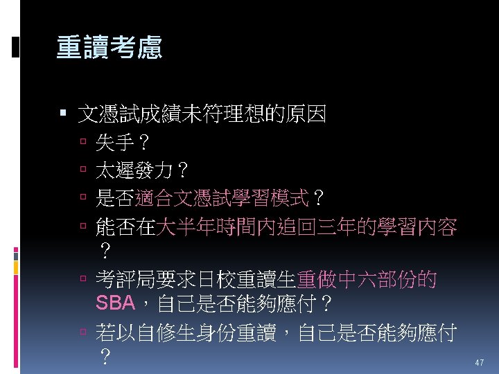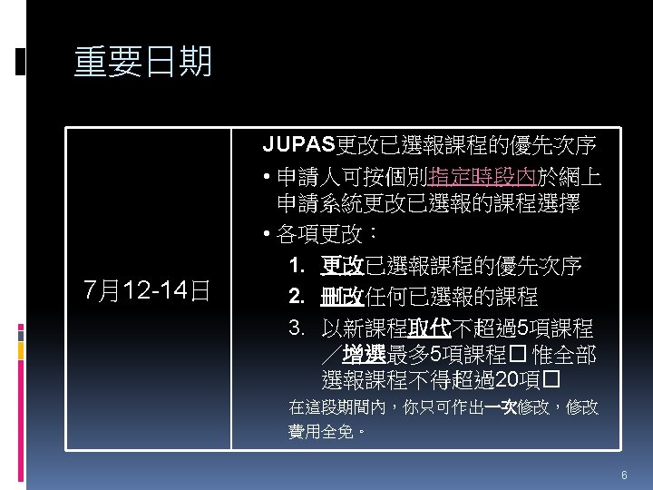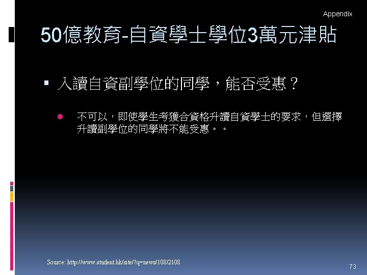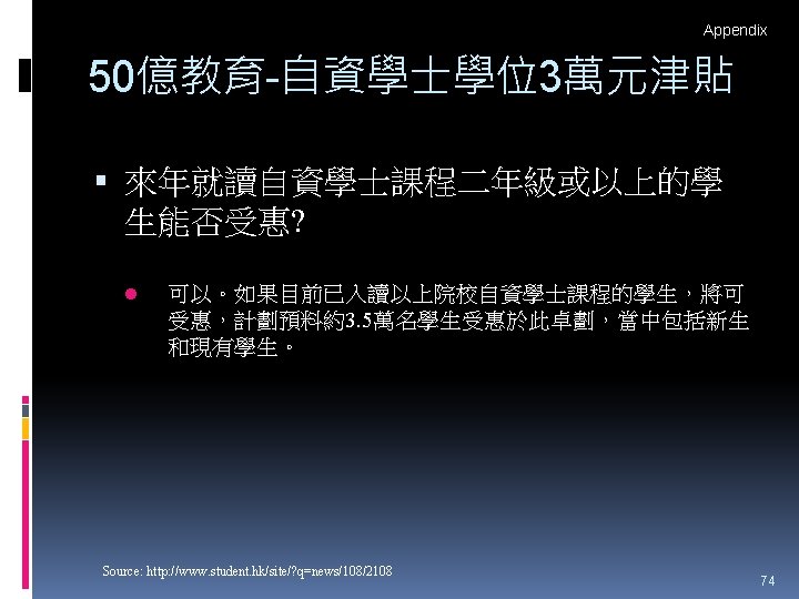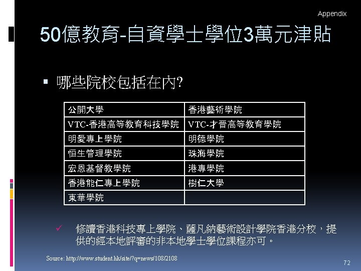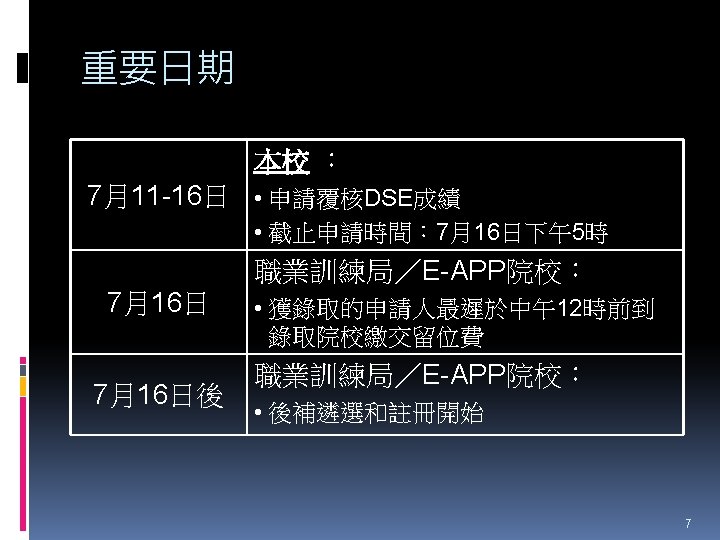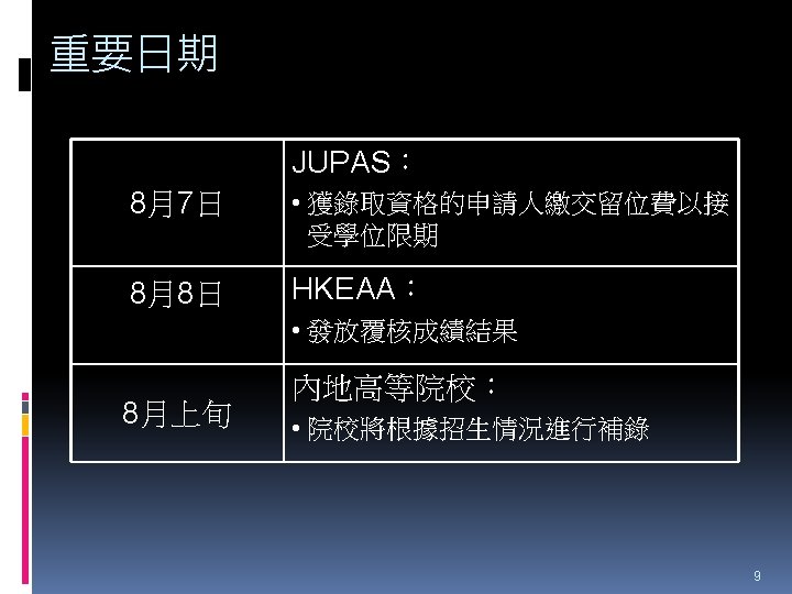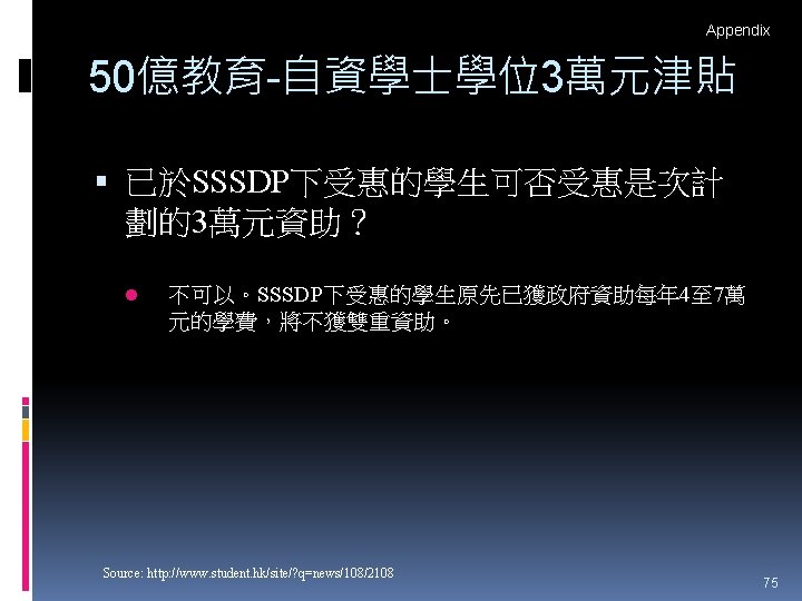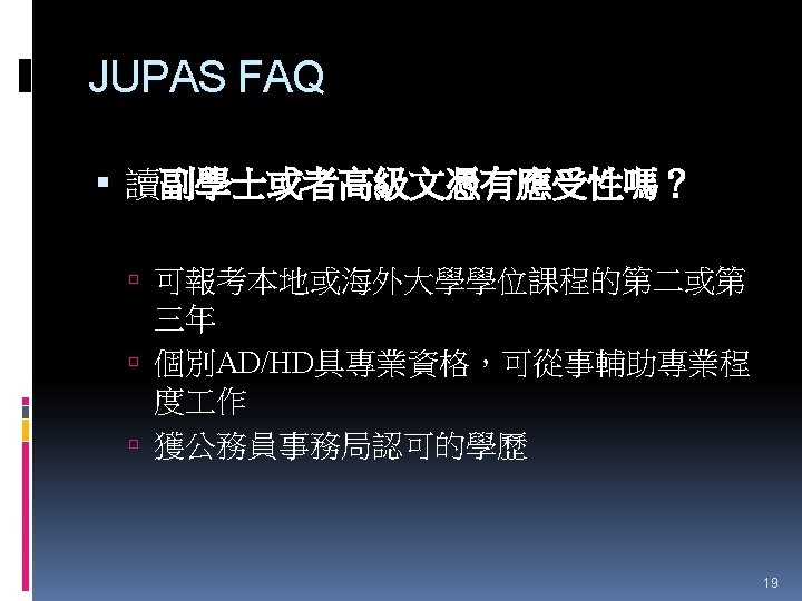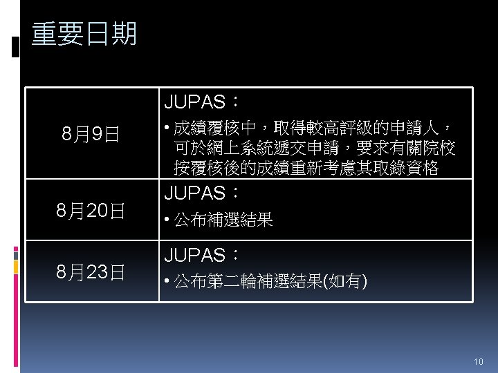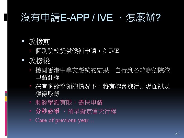 HTShum 2018 HKDSE DSE 2018 HKDSE 1 Dress Slides: 86 Download presentation HTShum 2018 HKDSE放榜提點 中六DSE - 2018 HKDSE放榜提點 1 Dress Code? http: //undergrad. bm. ust. hk/eng/why/publications/buzz_10 aug. pdf 非本地高等及專業教育課程 資料來源:教育局 https: //www. edb. gov. hk/tc/edu-system/postsecondary/non-local-higher-professional-edu/index. html/ 34 成績覆核(Appeal)成功率? 2012 DSE 覆核成功率 資料來源:考評局 -香港中學文憑考試統計概覽 http: //www. hkeaa. edu. hk/tc/HKDSE/assessment/exam_reports/exam_stat/ 39 成績覆核(Appeal)成功率? 2013 DSE 覆核成功率 資料來源:考評局 -香港中學文憑考試統計概覽 http: //www. hkeaa. edu. hk/tc/HKDSE/assessment/exam_reports/exam_stat/ 40 成績覆核(Appeal)成功率? 2014 DSE 覆核成功率 資料來源:考評局 -香港中學文憑考試統計概覽 http: //www. hkeaa. edu. hk/tc/HKDSE/assessment/exam_reports/exam_stat/ 41 成績覆核(Appeal)成功率? 2015 DSE 覆核成功率 資料來源:考評局 -香港中學文憑考試統計概覽 http: //www. hkeaa. edu. hk/tc/HKDSE/assessment/exam_reports/exam_stat/ 42 成績覆核(Appeal)成功率? 2016 DSE 覆核成功率 資料來源:考評局 -香港中學文憑考試統計概覽 http: //www. hkeaa. edu. hk/tc/HKDSE/assessment/exam_reports/exam_stat/ 43 成績覆核(Appeal)成功率? 2017 DSE 覆核成功率 資料來源:考評局 -香港中學文憑考試統計概覽 http: //www. hkeaa. edu. hk/tc/HKDSE/assessment/exam_reports/exam_stat/ 44 2017 DSE表現 3322 + 2: 41. 1% DSE表現 20 949人 >22222: 69. 8% 34 673人 <22222: 30. 2% 15 023人 2018 HKDSE考生數目: 51 675人 學位: 考生出路 15 170資助 + 8 500自資 + 3 400內地 副學位: ~30 200 毅進/職業訓練 >10 500 46 Gear Up! Your future is not destined. Appendix e導航課程搜尋 具 http: //enavigator. edb. hkedcity. net 77 Appendix Admission Formula (Sub Weighting) JUPAS大學收生計法 個別院校及學系各有不同 例子 - 理大 4 C+1 X Account Applied Bio Chem Tech Fashion and Textile Social work Etc… Best 5 Engineering Hotel Management Surveying Computing Radiography Etc… 2 C+best 3 Design Nursing Occupational therapy Etc… Source: http: //www. polyu. edu. hk/as/ep_ft/avg-dse-scores. pdf 84 Appendix Admission Formula (Sub Weighting) 收生分數參考 1. http: //www. jupas. edu. hk/upload/useful_mater ial/af_2014. pdf 2. http: //www. jupas. edu. hk/upload/useful_mater ial/af_2013. pdf 3. www. plk 1984. edu. hk > 學生支援 > 升學輔 導 > 有用連結 > 本地大學 > 輔導教師協會統計 DSE-JUPAS 85 Appendix Admission Formula (Sub Weighting) 以下院校有提供清晰的計分方程 City http: //www. admo. cityu. edu. hk/jupas_hkdse/assessment/ CU http: //www 5. cuhk. edu. hk/oafa/index. php/jupas-4 -year- cohort-3/programme-information/39 -jupas/394 -calculationof-admission-scores HKUST http: //join. ust. hk/local/jupas/apply_jupas_entry_subject. html Poly http: //www. polyu. edu. hk/as/hkdse/faq. html http: //www 38. polyu. edu. hk/aseprospectus/jsp/misc_bookmar k. jsp? cms_menu_id=8030&website. Id=1&scheme. Id=201310 &lang. Id=1 86