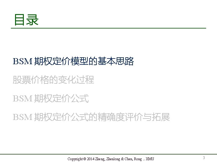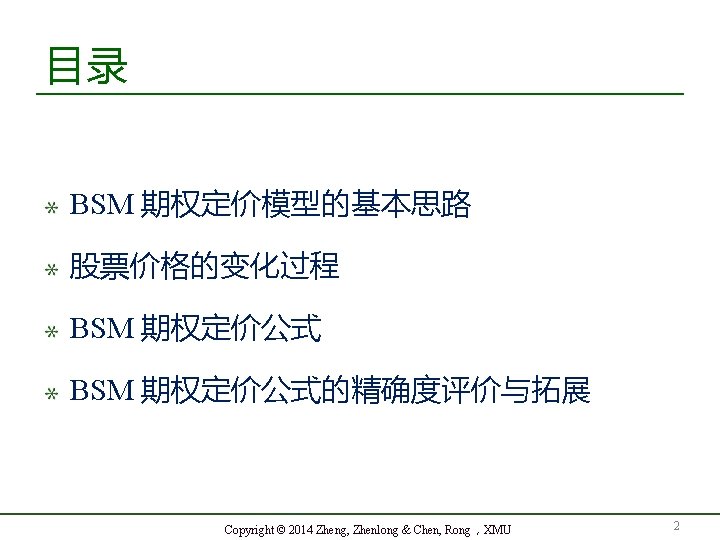http efinance org cn http aronge net Copyright Slides: 77 Download presentation 金融 程 第十一章 布莱克 -舒尔斯 -默顿期权定价模型 厦门大学金融系 郑振龙 陈蓉 http: // efinance. org. cn http: // aronge. net Copyright © 2014 Zheng, Zhenlong & Chen, Rong, XMU HS 300指数: 2005. 1. 5~ 2012. 10. 16 蓉 学 陈 大 门 t© h ig 厦 r y p Co Copyright © 2014 Zheng, Zhenlong & Chen, Rong,XMU 9 市场有效理论与随机过程 Copyright © 2014 Zheng, Zhenlong & Chen, Rong,XMU 10 证明(1)泰勒展开 G 的泰勒展开式为: Copyright © 2014 Zheng, Zhenlong & Chen, Rong,XMU 16 (4)取极限 代入 可得 Copyright © 2014 Zheng, Zhenlong & Chen, Rong,XMU 19 应用 1:衍生品价格所服从的随机过程 Copyright © 2014 Zheng, Zhenlong & Chen, Rong,XMU 21 S = 50, µ = 0. 18, σ = 0. 2, T − t = 0. 5 年 因此 6 个月后ST的概率分布为 即 Copyright © 2014 Zheng, Zhenlong & Chen, Rong,XMU 27 Copyright © 2014 Zheng, Zhenlong & Chen, Rong,XMU 29 1900-2000主要国家股指实际收益率 蓉 学 陈 大 门 t© h ig 厦 r y p Co Copyright © 2014 Zheng, Zhenlong & Chen, Rong,XMU 31 预期收益率 µ Copyright © 2014 Zheng, Zhenlong & Chen, Rong,XMU 32 样本间隔/计算方式比较 蓉 学 陈 大 门 t© h ig 厦 r y p Co Copyright © 2014 Zheng, Zhenlong & Chen, Rong,XMU 34 由于在风险中性世界中 Copyright © 2014 Zheng, Zhenlong & Chen, Rong,XMU 49 积分可得 其中 Copyright © 2014 Zheng, Zhenlong & Chen, Rong,XMU 50 BSM 期权定价公式的推导 由于 和 令 Copyright © 2014 Zheng, Zhenlong & Chen, Rong,XMU 51 其中 显然 即随机变量 W 的密度函数 h(W) 为 Copyright © 2014 Zheng, Zhenlong & Chen, Rong,XMU 52 Copyright © 2014 Zheng, Zhenlong & Chen, Rong,XMU 53 理解BSM定价公式I Copyright © 2014 Zheng, Zhenlong & Chen, Rong,XMU 54 理解 II 从金融 程的角度来看,欧式看涨期权可以 分拆成或有资产看涨期权( Asset-or-nothing Call Option )多头和 X 份或有现金看涨期权 ( Cash-or-nothing Call Option )空头之和 Copyright © 2014 Zheng, Zhenlong & Chen, Rong,XMU 55 理解 III Copyright © 2014 Zheng, Zhenlong & Chen, Rong,XMU 56 波动率微笑 - 58 Copyright © 2014 Zheng, Zhenlong & Chen, Rong,XMU 波动率期限结构 隐含波动率与期限的关系 黄金期货期权波动率期限结构(2014. 6. 3) 18 17 16 C P 15 14 13 2013年 2月 2014年 7月 2015年 11月 2017年 3月 2018年 8月 Copyright © 2014 Zheng, Zhenlong & Chen, Rong,XMU 2019年 12月 59 限 期 余 剩 隐含波动率曲面 在值程度 - 60 Copyright © 2014 Zheng, Zhenlong & Chen, Rong,XMU 欧式平价期权的定价公式 欧式平价看涨期权 Copyright © 2014 Zheng, Zhenlong & Chen, Rong,XMU 61 平价期权 c/S与波动率与期限的关系 Copyright © 2014 Zheng, Zhenlong & Chen, Rong,XMU 62 Copyright © 2014 Zheng, Zhenlong & Chen, Rong,XMU 66 估计标的资产价格的波动率 I 历史波动率 样本对数收益率标准差(案例 11. 7 ) 广义自回归条件异方差模型( Generalized Autoregressive Conditional Heteroskedasticity, GARCH )和随机波动率模型 隐含波动率 Copyright © 2014 Zheng, Zhenlong & Chen, Rong,XMU 72 Any Questions? Copyright © 2014 Zheng, Zhenlong & Chen, Rong,XMU 76 Email: zlzheng@xmu. edu. cn aronge@xmu. edu. cn Copyright © 2014 Zheng, Zhenlong & Chen, Rong,XMU 77
