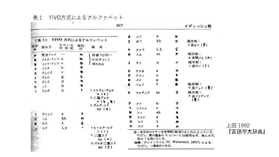 ヘブライ語とスラブ語からの借用語 表5 ヘブライ語からの借用語 表6 スラブ語からの借用語の例 emes truth stade flock, herd eytse advice vetshere supper mishpokhe family same indeed ponem face take exactly, indeed shabes shabbad nebekh the poor thing! toyre torah ot here, there; just Yontef holiday zhe so, then (emphasis)