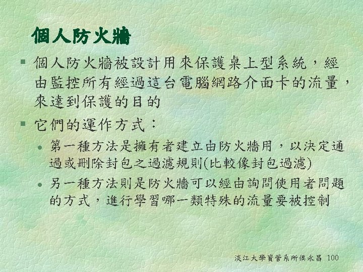 Application-Level Proxies § In addition to controlling inbound traffic, all outbound traffic requests look as if they were coming from a single computer rather than multiple computers. In this way, the IP address of the internal computers are hidden to the outside § Disadvantage: l l It takes more processing time to tie particular packets to particular applications The users on the internal network must configure their machines or browsers to send their Internet requests via the proxy server 淡江大學資管系所侯永昌 99