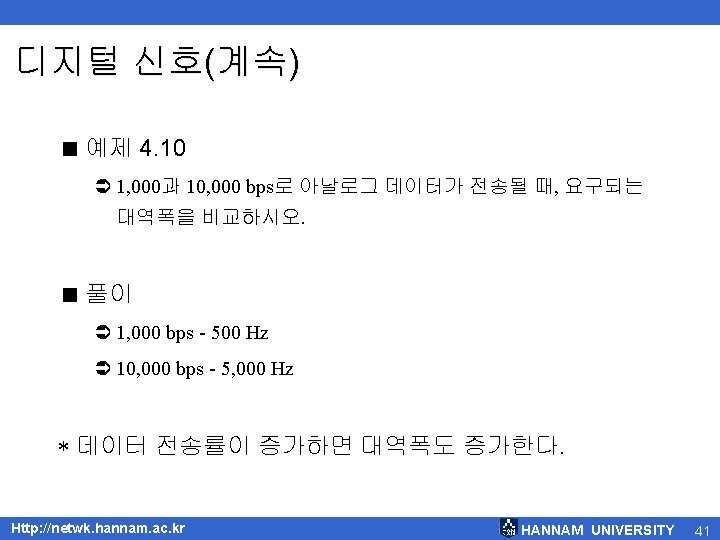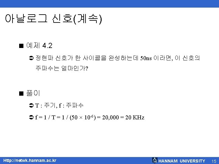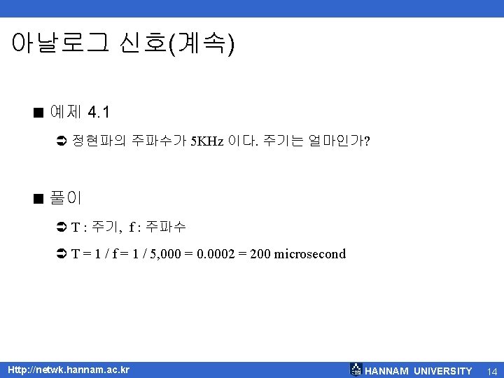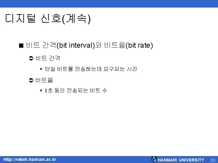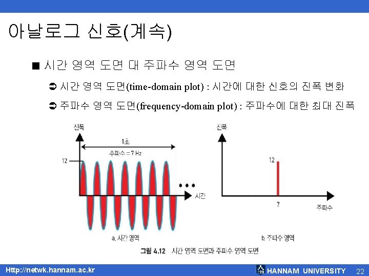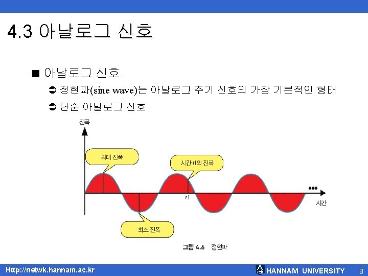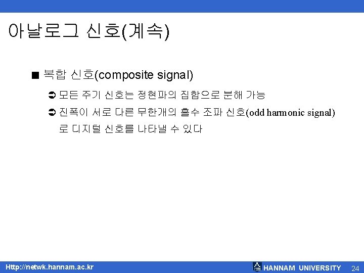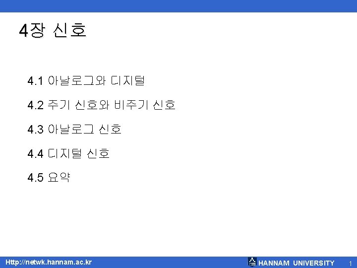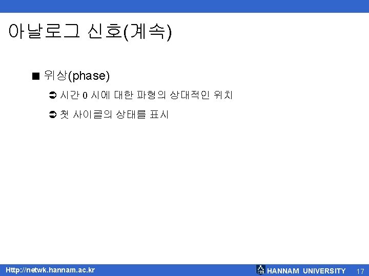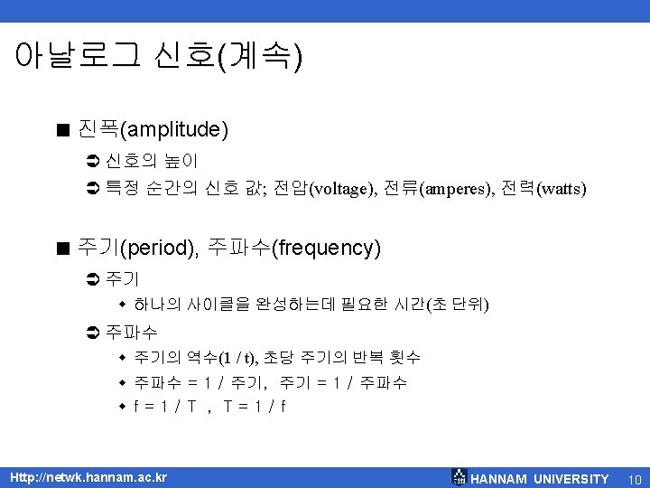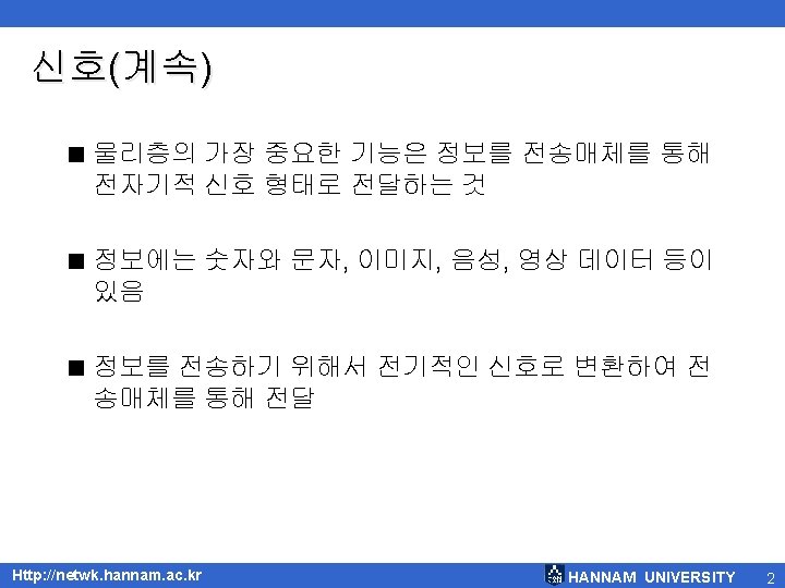 Http netwk hannam ac kr HANNAM UNIVERSITY 3 Slides: 46 Download presentation 신호(계속) 정보를 신호로 변환 Http: //netwk. hannam. ac. kr HANNAM UNIVERSITY 3 아날로그 신호(계속) < 정현파의 3가지 특성 Ü amplitude(진폭) Ü period(주기), frequency(주파수) Ü phase(위상) Http: //netwk. hannam. ac. kr HANNAM UNIVERSITY 9 아날로그 신호(계속) Http: //netwk. hannam. ac. kr HANNAM UNIVERSITY 11 아날로그 신호(계속) Ü 주파수 단위 w 독일 물리학자 하인리히 루돌프 헤르츠(Heinrich Rudolf Hertz) w Hertz(Hz)로 표현 Http: //netwk. hannam. ac. kr HANNAM UNIVERSITY 12 아날로그 신호(계속) Ü 주기 단위 w 초로 표현 Http: //netwk. hannam. ac. kr HANNAM UNIVERSITY 13 아날로그 신호(계속) < 여러 위상들의 관계 Http: //netwk. hannam. ac. kr HANNAM UNIVERSITY 18 아날로그 신호(계속) < 진폭 변화 Http: //netwk. hannam. ac. kr HANNAM UNIVERSITY 19 아날로그 신호(계속) < 주파수 변화 Http: //netwk. hannam. ac. kr HANNAM UNIVERSITY 20 아날로그 신호(계속) < 위상 변화 Http: //netwk. hannam. ac. kr HANNAM UNIVERSITY 21 아날로그 신호(계속) < 직류 요소를 갖는 신호 Http: //netwk. hannam. ac. kr HANNAM UNIVERSITY 25 아날로그 신호(계속) < 대역폭(Bandwidth) Http: //netwk. hannam. ac. kr HANNAM UNIVERSITY 28 4. 4 디지털 신호 < 디지털 신호 Http: //netwk. hannam. ac. kr HANNAM UNIVERSITY 31 디지털 신호(계속) < 진폭(amplitude), 주기(periodic), 위상(phase) Http: //netwk. hannam. ac. kr HANNAM UNIVERSITY 32 디지털 신호(계속) < 비트율(bit rate)과 비트 간격(bit interval) Http: //netwk. hannam. ac. kr HANNAM UNIVERSITY 34 디지털 신호(계속) < 예제 4. 12 Http: //netwk. hannam. ac. kr HANNAM UNIVERSITY 44 4. 5 요약 Http: //netwk. hannam. ac. kr HANNAM UNIVERSITY 45