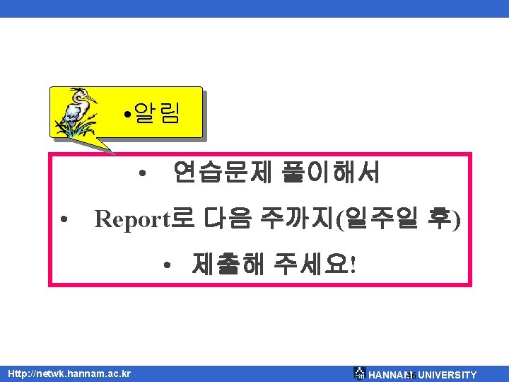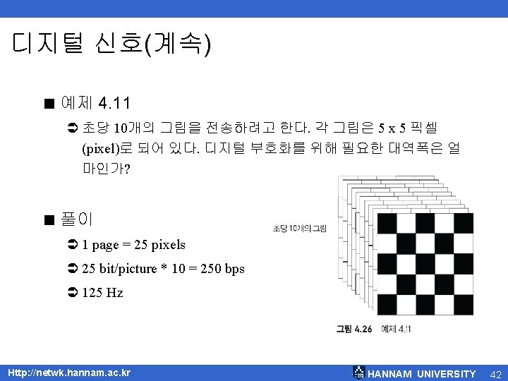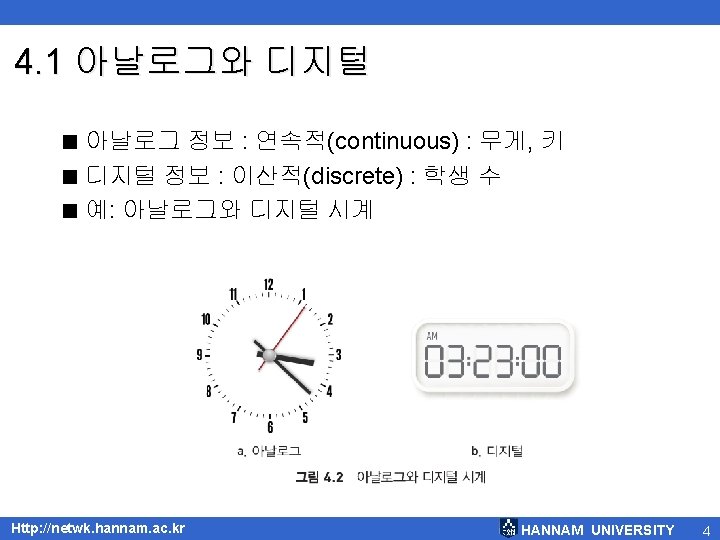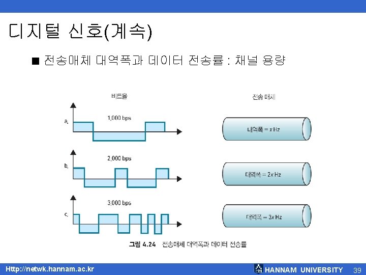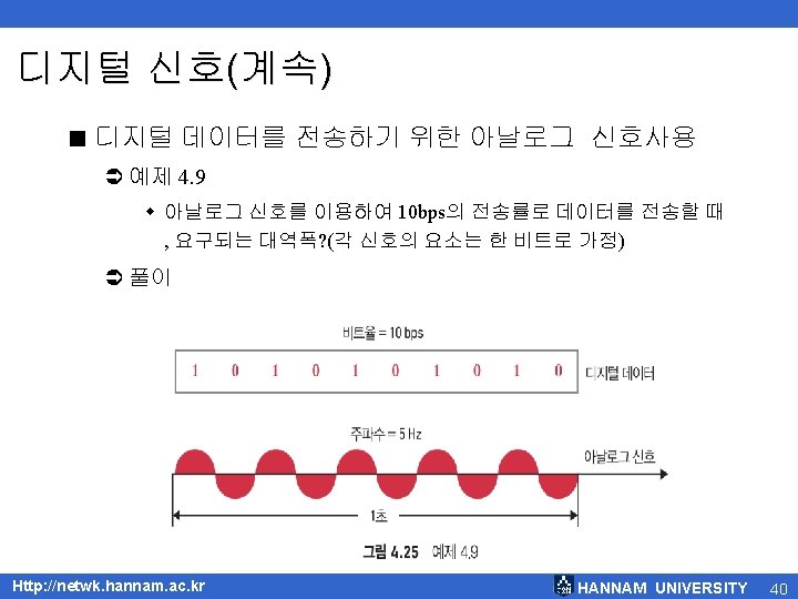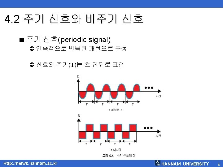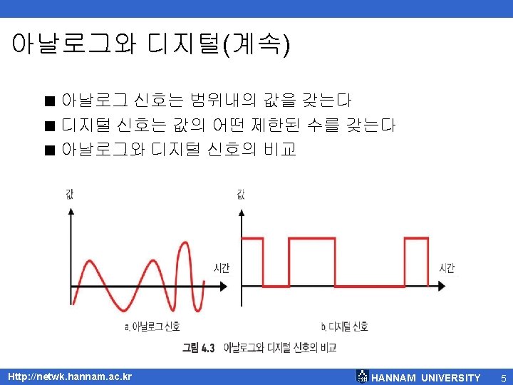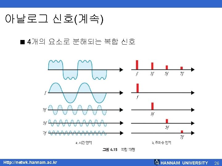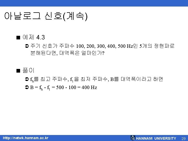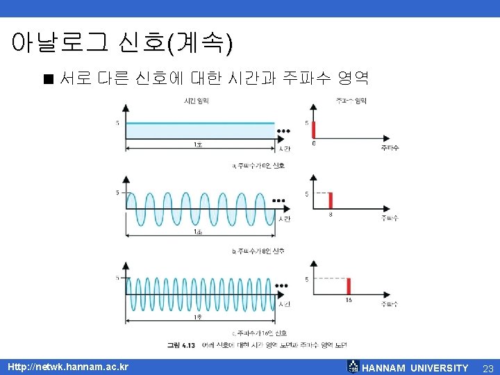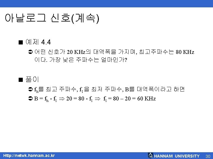 Http netwk hannam ac kr HANNAM UNIVERSITY 3 Slides: 46 Download presentation 신호(계속) 정보를 신호로 변환 Http: //netwk. hannam. ac. kr HANNAM UNIVERSITY 3 아날로그 신호(계속) < 정현파의 3가지 특성 Ü amplitude(진폭) Ü period(주기), frequency(주파수) Ü phase(위상) Http: //netwk. hannam. ac. kr HANNAM UNIVERSITY 9 아날로그 신호(계속) Http: //netwk. hannam. ac. kr HANNAM UNIVERSITY 11 아날로그 신호(계속) Ü 주파수 단위 w 독일 물리학자 하인리히 루돌프 헤르츠(Heinrich Rudolf Hertz) w Hertz(Hz)로 표현 Http: //netwk. hannam. ac. kr HANNAM UNIVERSITY 12 아날로그 신호(계속) Ü 주기 단위 w 초로 표현 Http: //netwk. hannam. ac. kr HANNAM UNIVERSITY 13 아날로그 신호(계속) < 여러 위상들의 관계 Http: //netwk. hannam. ac. kr HANNAM UNIVERSITY 18 아날로그 신호(계속) < 진폭 변화 Http: //netwk. hannam. ac. kr HANNAM UNIVERSITY 19 아날로그 신호(계속) < 주파수 변화 Http: //netwk. hannam. ac. kr HANNAM UNIVERSITY 20 아날로그 신호(계속) < 위상 변화 Http: //netwk. hannam. ac. kr HANNAM UNIVERSITY 21 아날로그 신호(계속) < 직류 요소를 갖는 신호 Http: //netwk. hannam. ac. kr HANNAM UNIVERSITY 25 아날로그 신호(계속) < 대역폭(Bandwidth) Http: //netwk. hannam. ac. kr HANNAM UNIVERSITY 28 4. 4 디지털 신호 < 디지털 신호 Http: //netwk. hannam. ac. kr HANNAM UNIVERSITY 31 디지털 신호(계속) < 진폭(amplitude), 주기(periodic), 위상(phase) Http: //netwk. hannam. ac. kr HANNAM UNIVERSITY 32 디지털 신호(계속) < 비트율(bit rate)과 비트 간격(bit interval) Http: //netwk. hannam. ac. kr HANNAM UNIVERSITY 34 디지털 신호(계속) < 예제 4. 12 Http: //netwk. hannam. ac. kr HANNAM UNIVERSITY 44 4. 5 요약 Http: //netwk. hannam. ac. kr HANNAM UNIVERSITY 45