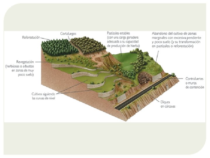 MESURES PER FRENAR L’EROSIÓ Mantenir el sòl amb vegetació � Sentit llaurades amb corbes de nivell de terreny: menys escolament. � Bancals de pedra per afavorir la retenció d’aigua. � Dics en xaragalls. � Repoblacions forestals. � Dics en xaragalls