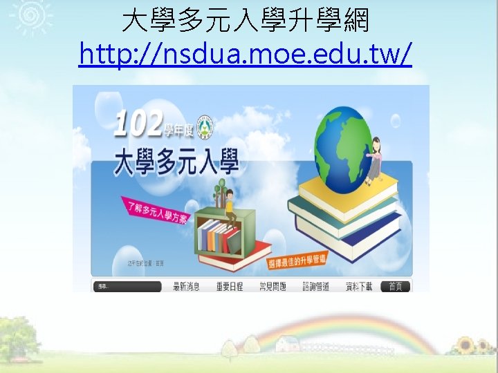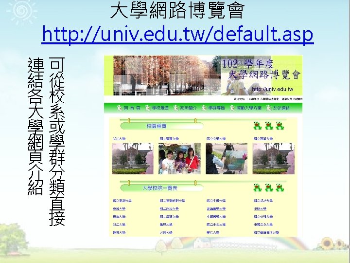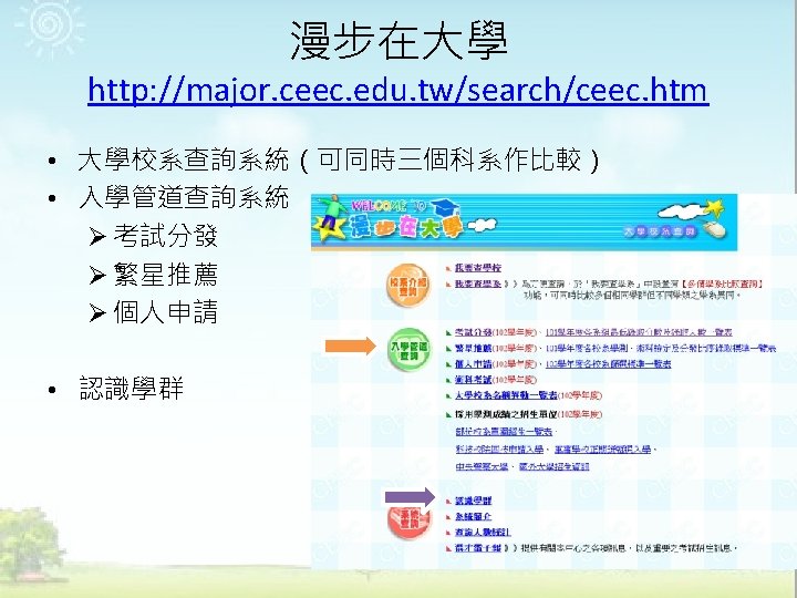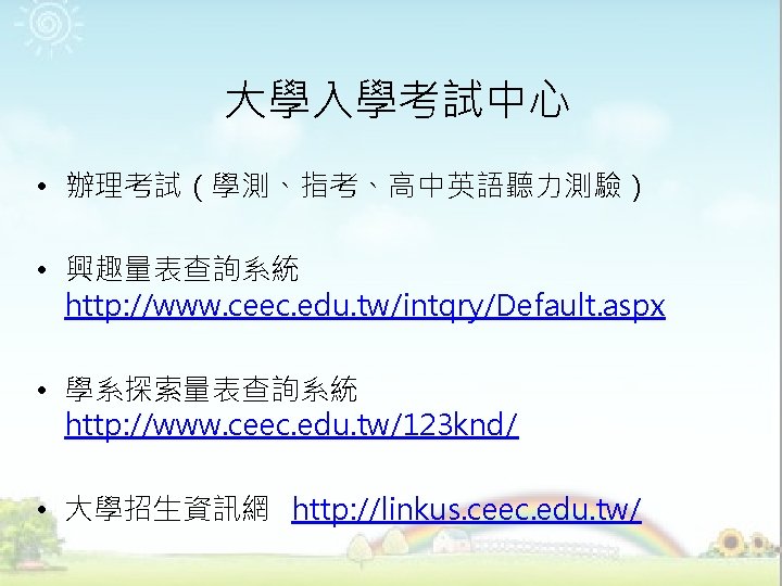 http www ceec edu twdefault htm 104 http Slides: 14 Download presentation 大學入學考試中心 http: //www. ceec. edu. tw/default. htm 104升學就業地圖 http: //www. 104. com. tw/jb/career/department/index 就業職能平台 https: //ucan. moe. edu. tw/ 竹北高中輔導室 http: //counseling. cpshs. hcc. edu. tw/front/bin/home. phtml 非常重要