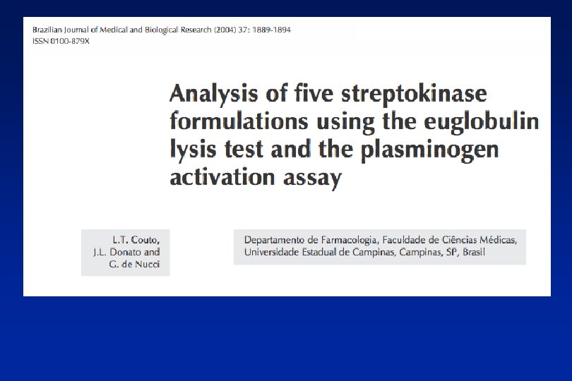 Couto L. T; et al. Analysis of five streptokinase formulations using the euglobulin lysis test and the plasminogen activation assay. Braz J Med Biol Res 2004; 37: 1889– 1894.