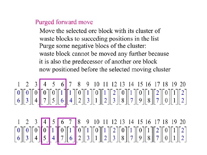 Decoding of a representation PR into a solution x • Serial decoding to schedule blocks sequentially one by one to be extracted • To initiate the first extraction period t = 1: remove the block among those having no predecessor (i. e. , in the top layer) having the highest priority. • During any period t, at any stage of the decoding scheme: the next block to be removed is one of those with the highest priority among those having all their predecessors already extracted such that the capacity Ct is not exceeded by its extraction. If no such block exists, then a new extraction period (t + 1) is initiated.