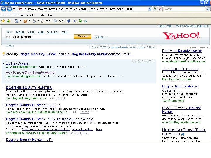Behind the scenes: keyword auction Site bids for keyword: “dog the bounty hunter” Web site A Web site B Web site C bid $ Other data (site content, ad content, account, …) Display ranking Web site B Search engine ad ranking Web site A Web site C