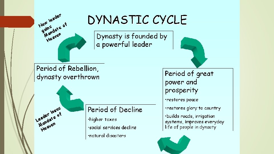 Mandate of Heaven: Divine power to be the emperor of China given to virtuous leaders *If a leader does good for the people and always behaves correctly, then he is granted the power to rule by the gods/heavens (higher power) and can keep it; If he doesn’t act right and follow his duties as emperor, then he loses it (the power) *Concept was started by the Zhou Dynasty to justify taking power