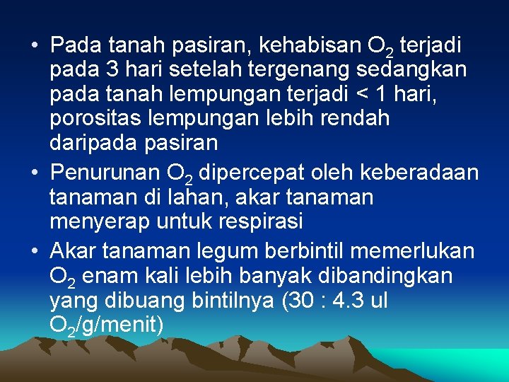 • Kondisi anoksia tercapai pada jangka waktu 6 – 8 jam setelah genangan, karena O 2 terdesak oleh air dan sisa O 2 dimanfaatkan oleh mikroorganisme • Pada kondisi tergenang, kandungan O 2 yang tersisa di tanah lebih cepat habis bila ada tanaman • Laju difusi O 2 di tanah basah 20000 kali lebih lambat dibandingkan di udara • Laju penurunan O 2 dipengaruhi oleh tekstur tanah